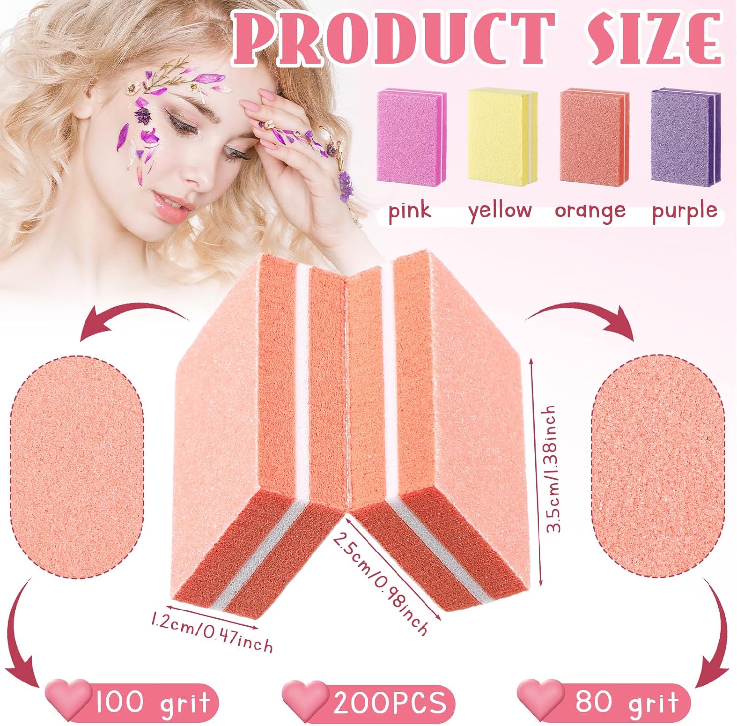 - Double Sided Design: these nail buffers feature two sides, styled in pink, orange, yellow and purple, so you can choose either side according to your preference, as it offers two different grits for polishing; The 100 grit coarse side is designed to file uneven nail surfaces, while the 180 grit fine side helps buff away oils and smooth rough edges, easily refining your nails