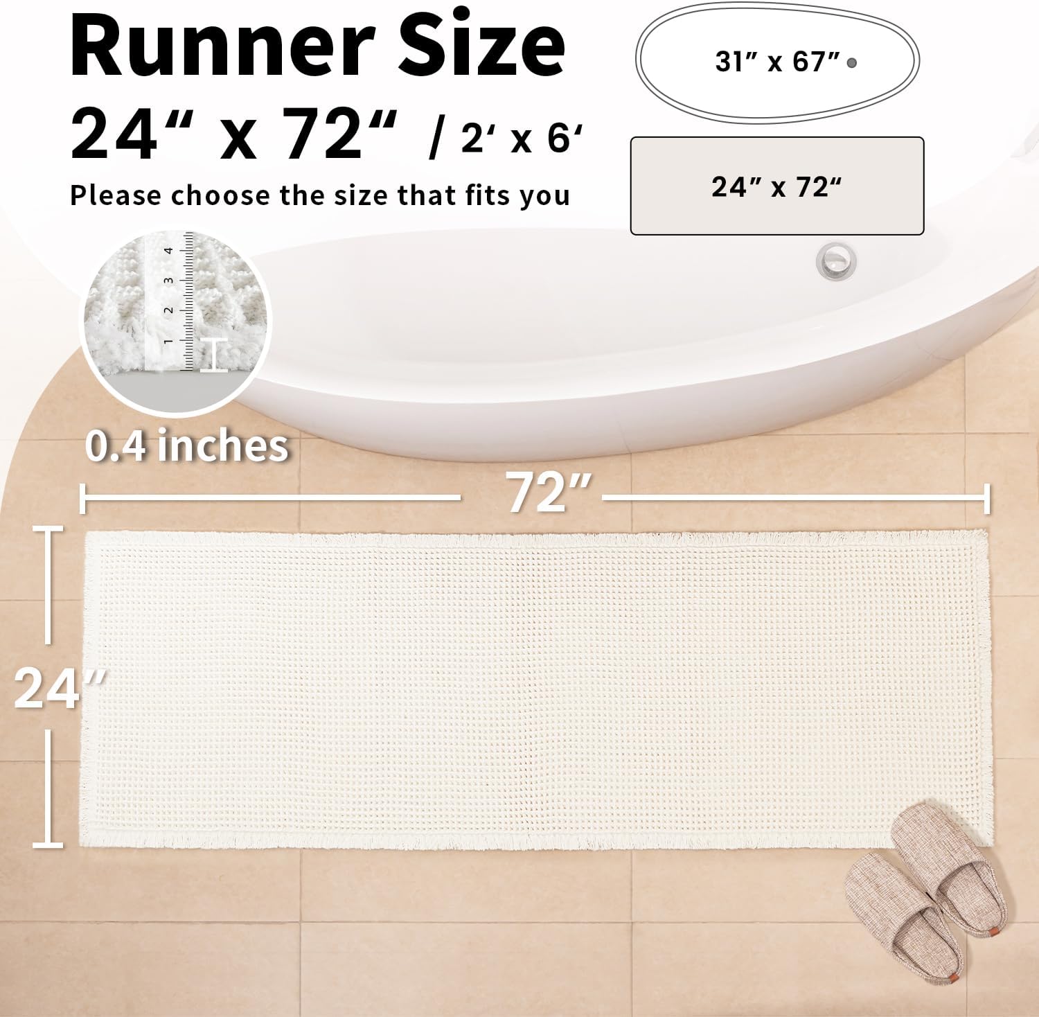 White Long Bathroom Rugs, Waffle Runner Bath Mat Non Slip Washable, Super Absorbent & Quick Dry, Boho Bath Mat Farmhouse Bathroom Decor, 24'' x 72'', White
