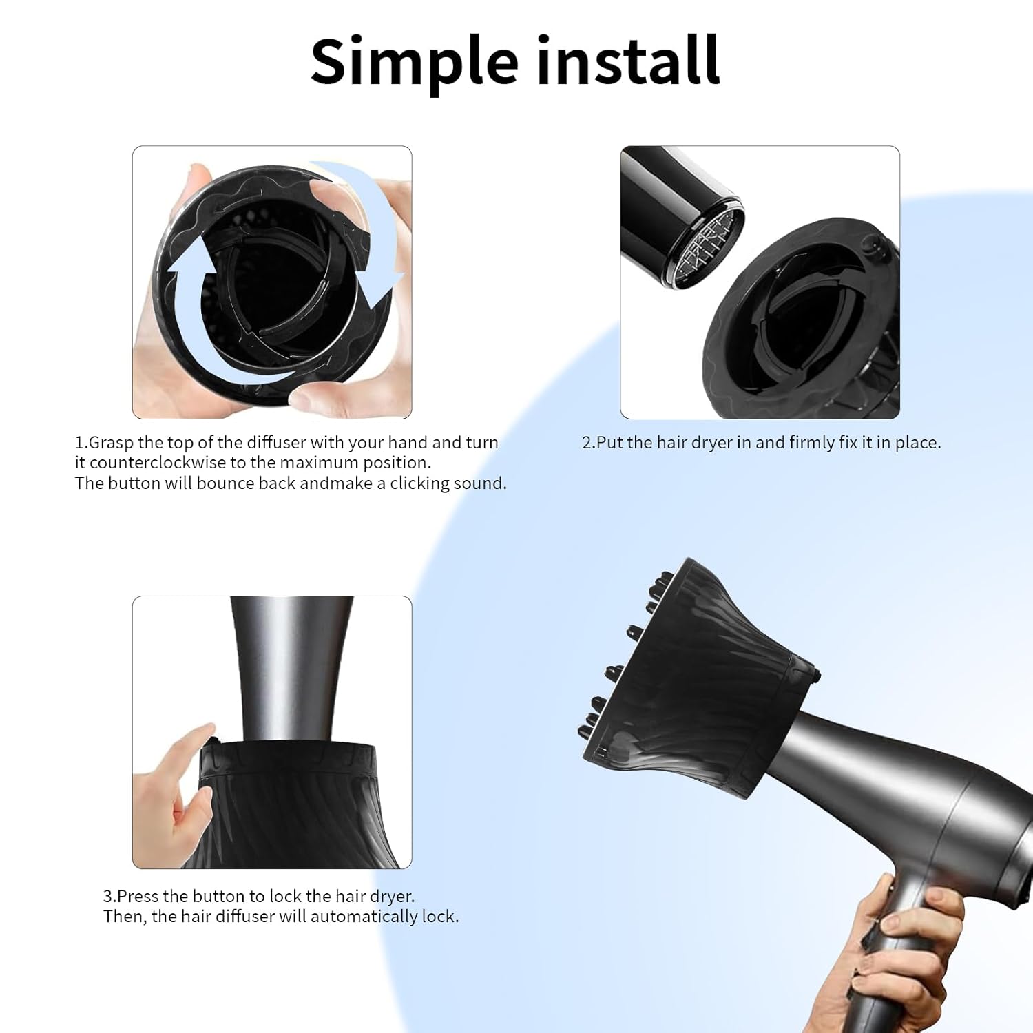 - Diffuser hair dryer effectively reduces frizz, adds volume, defines wavy curls, and enhances the overall texture of your hair. only Twist the top of hair dryer diffuser attachment counterclockwise to enlarge the opening, slip dryer nozzle into hair diffuser and release.Unlock the full potential of your locks with our game-changing hair diffuser. Show off your gorgeous, bouncy curls with utmost confidence and flair.