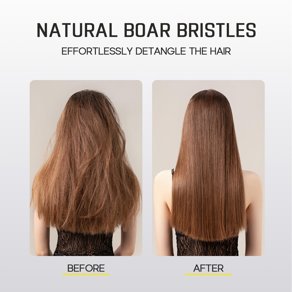 - Double layer bristle structure: composed of a mixture of natural hog bristle and nylon, elastic backing, with a good elasticity, effective detangling of the hair knotting problem, while reducing static electricity, so that the hair has a more Shiny feeling
