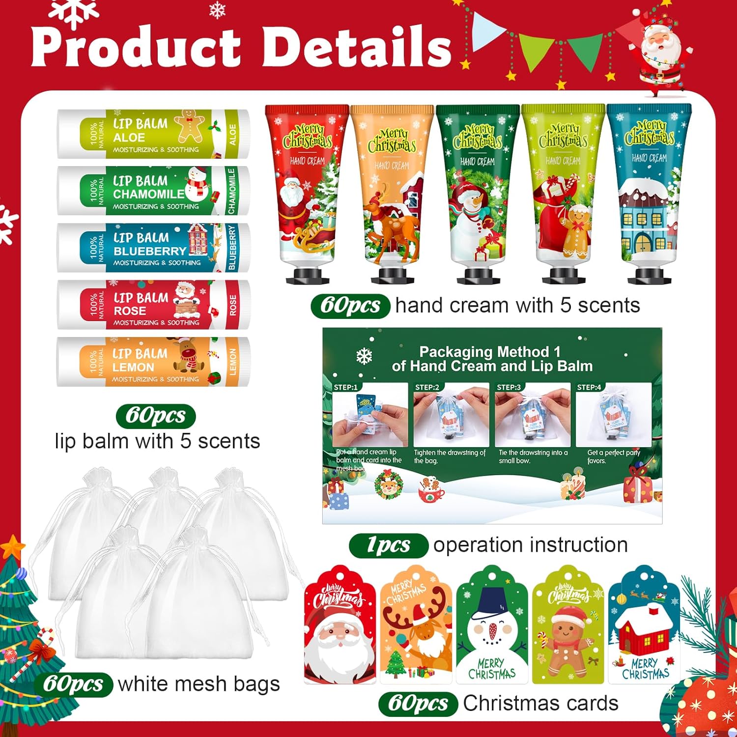 - 【60 Pack Bulk Christmas Gifts】Our Christmas gifts set includes 60pcs hand creams with 5 scents,60pcs lip balms with 5 scents,60pcs organza gift bags,60pcs Christmas cards and 1pcs operation manual.Multiple accessories,easy to assemble and carry,added a unique and warm holiday atmosphere to Christmas