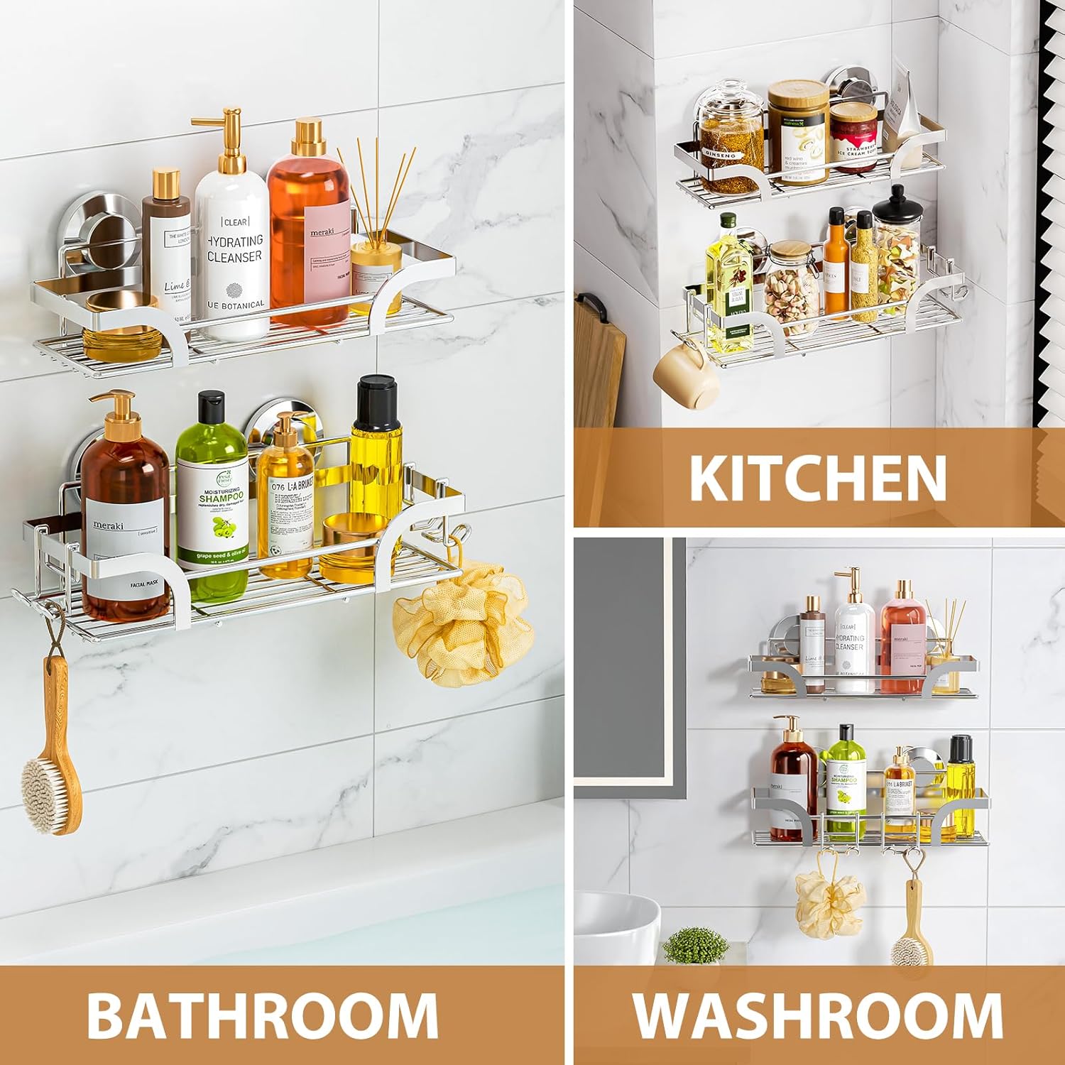 - Durable & Sturdy Suction: Suction Cup with bionic design of octopus tentacles ensures weather proof(-4°F-174°F), waterproof, and anti-aging; Suction Cup of shower shelf for inside shower with thicken plastic can hold up to 10 KG / 22 lbs and stick sturdy for years after installation without any concerns
