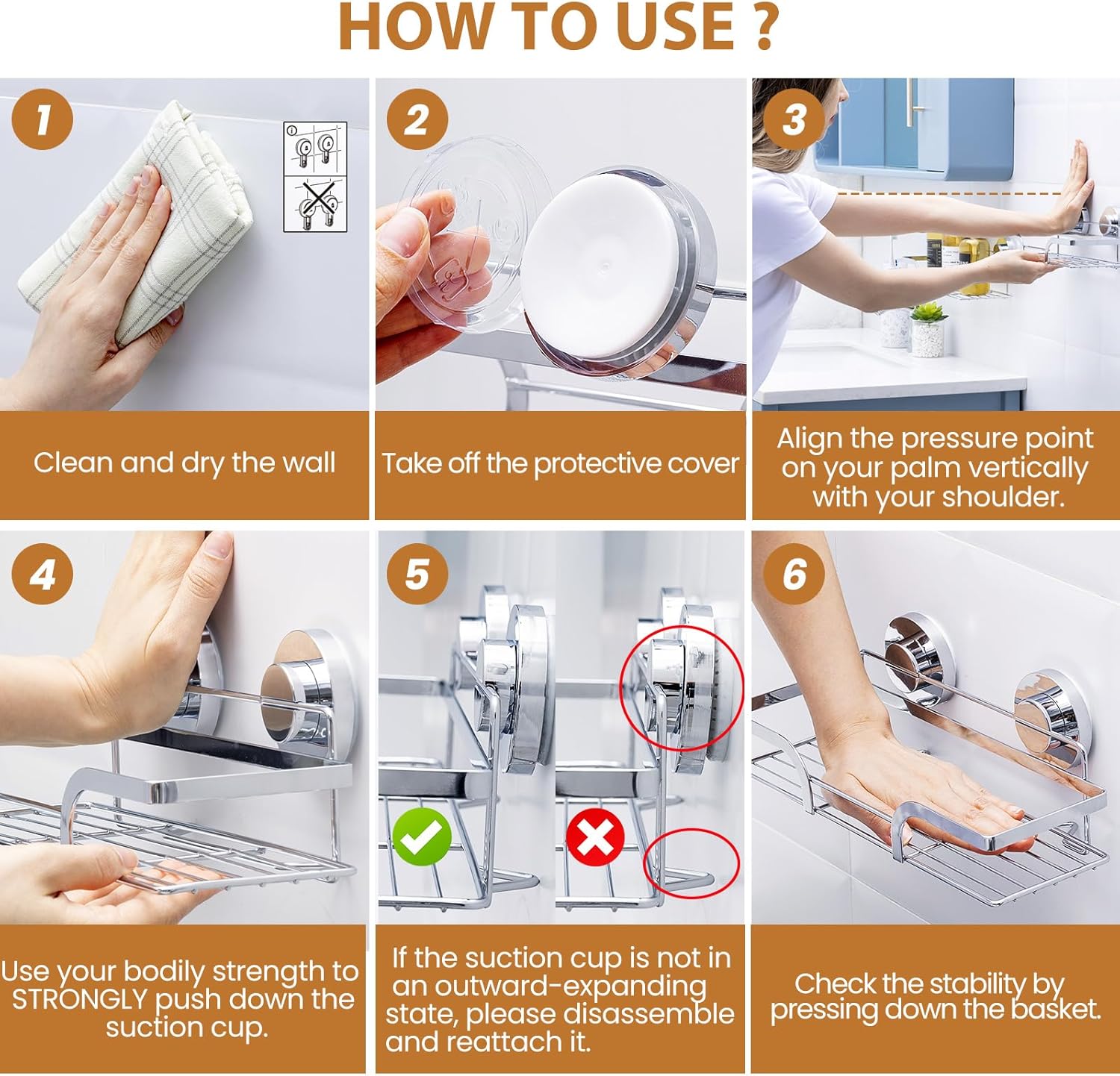 - Easy Installation: No drilling, no glue, no tools, and no waiting required to use the shower shelves. Simply choose a smooth and dry surface without any grout, take off the protective cover and push the board "PUSH" STRONGLY until you hear "PUFF", ONE second to complete the installation. The suction cup is removable without leaving any marks, so you can adjust installation position whenever you want
