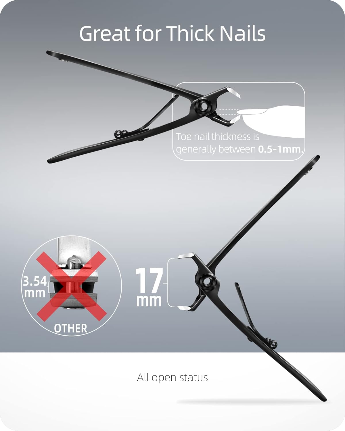 - Heavy Duty Toenail Clippers for Thick Toenails: The thick toenail clippers has a wide jaw up to 17mm, use this large toenail clippers for thick nails and hard nails.