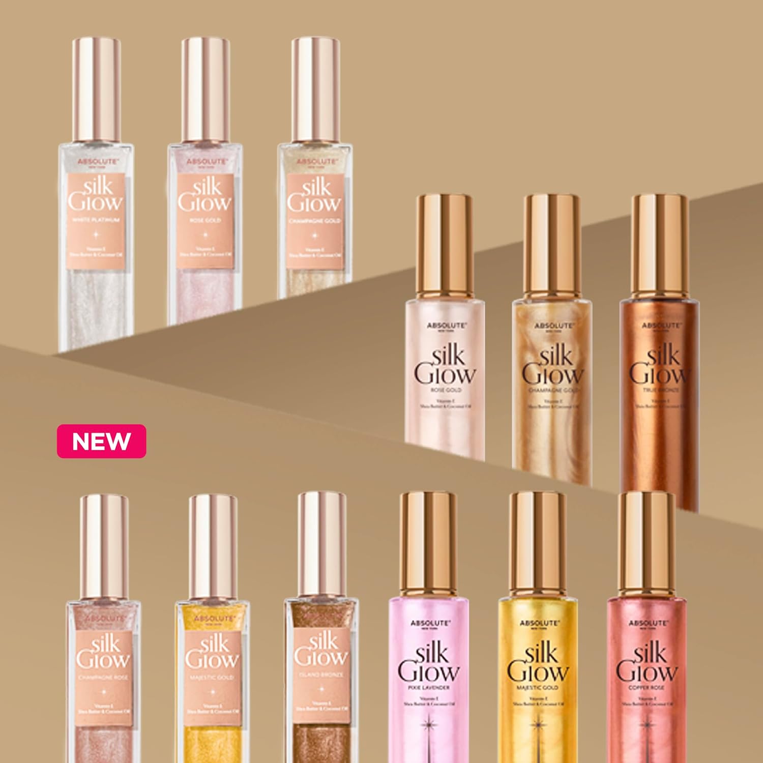 - 【FEATURES】 Give skin a radiant, sun-kissed glow with Absolute New York’s Silk Glow Body Oils! Infused with Vitamin E, Shea Butter, and Coconut Oil for moisture and glow that lasts all day.