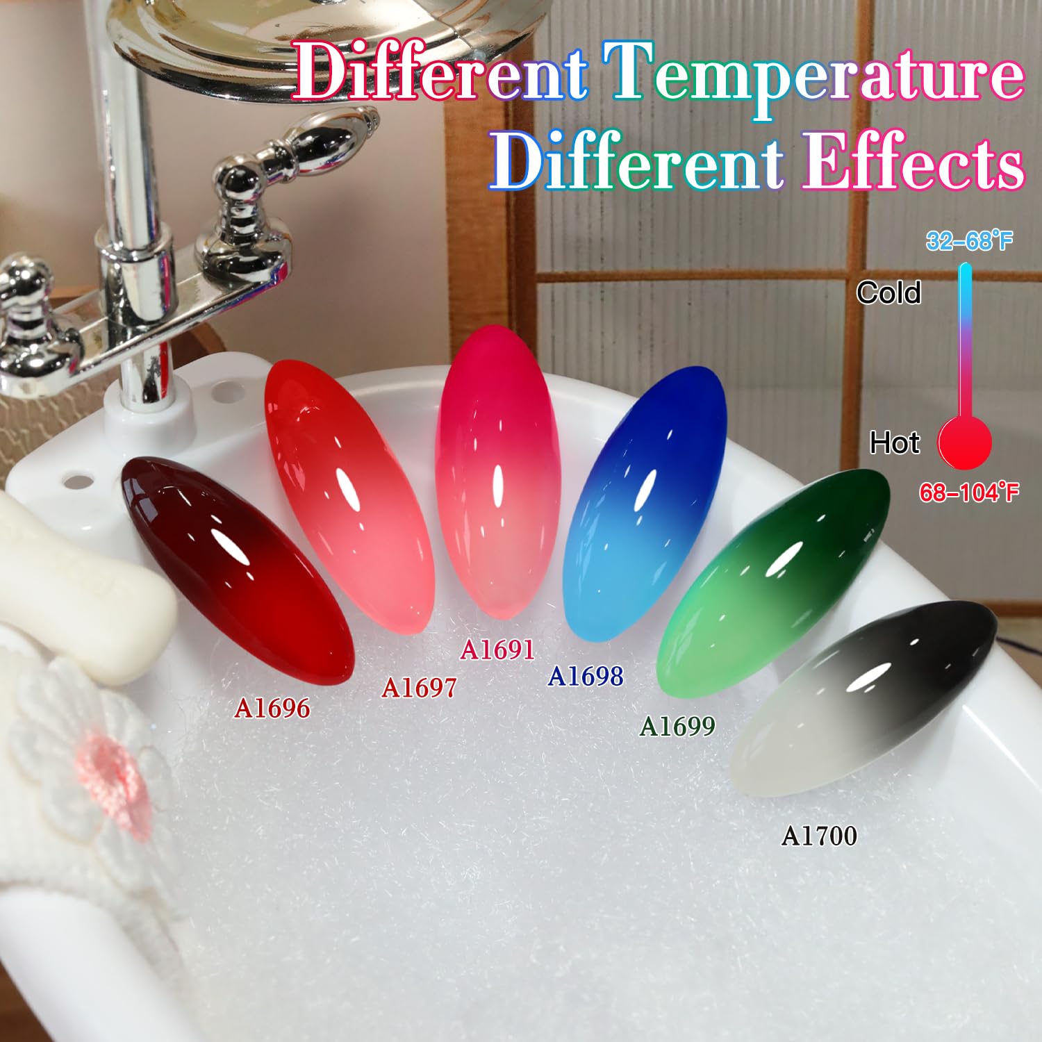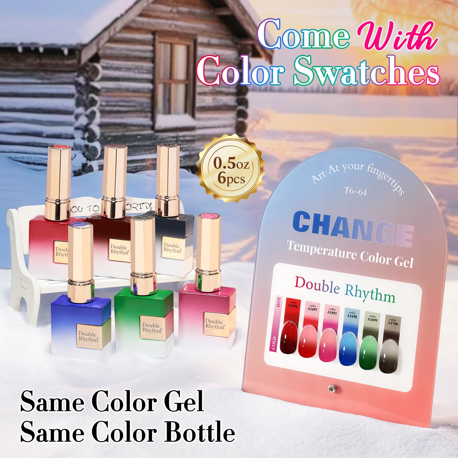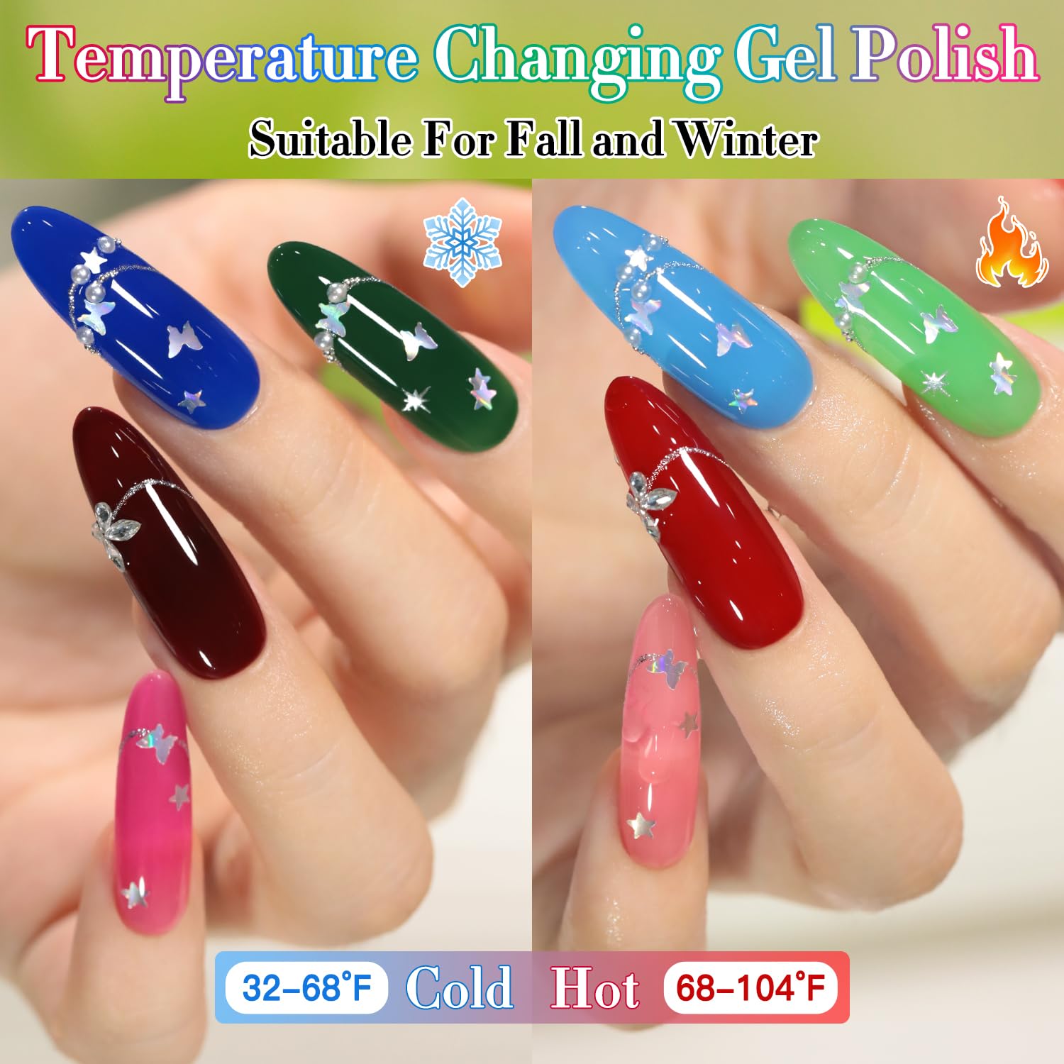 - 6 Pcs Same Color Same Bottle Gel Polish: 6pcs 15ml temperature color changing gel polish for all season, need to be cured under UV or LED Lamp for 60-120s. Must apply with Base Gel and Top Coat. Please shake the bottle or warm it with hot water before use, to acheive a better effect.