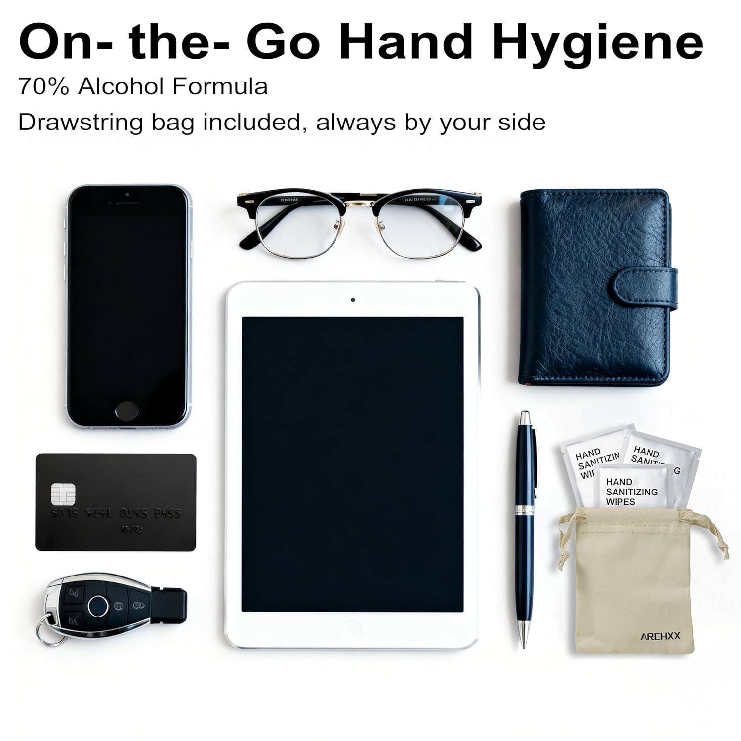 - On-the-Go Hygienic โ Compact and portable alcohol wipes, individually sealed for safe hygiene. Ideal as hand sanitizer for school and a practical hand sanitizer travel size option, a travel wipes perfect for daily use in the car, office, gym, and while commuting. All rinseโfree, no water needed