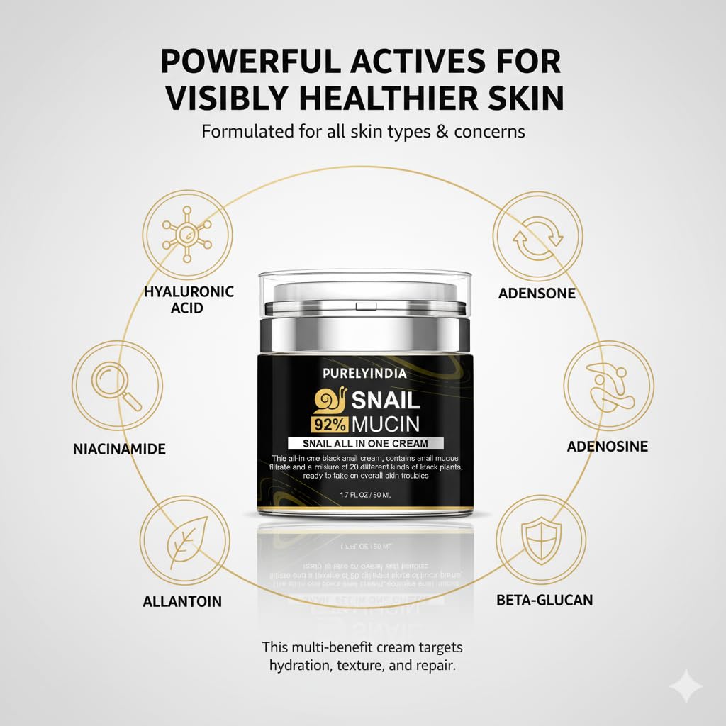 - Ultra-High Snail Mucin Concentration: Crafted with 92% snail secretion filtrate, this cream-serum delivers intense hydration, boosts collagen production, helps fade dark spots & smooth fine lines.