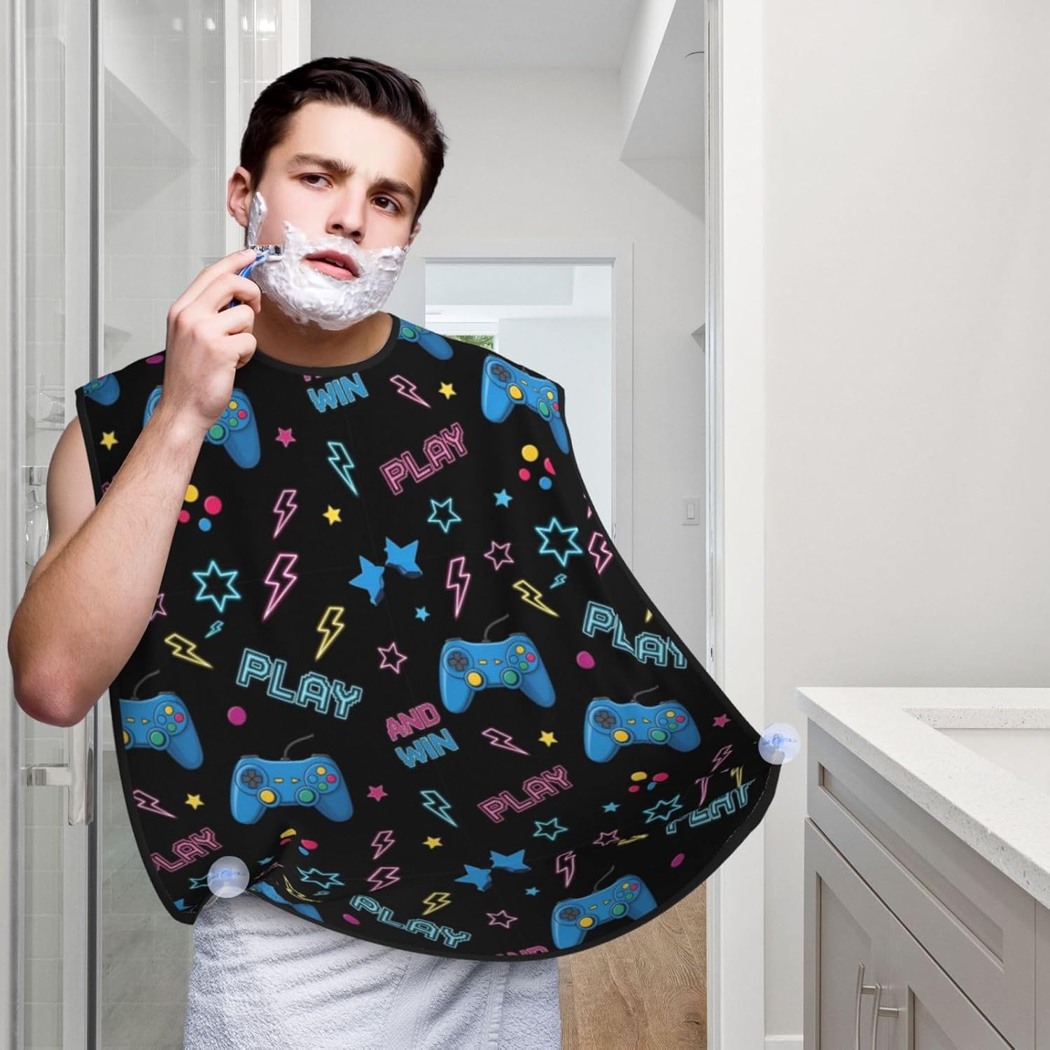 No-Slip Shaving Bib, Beard Grooming Apron with Strong Suction Cups, Video Gamers Video Game Blue
