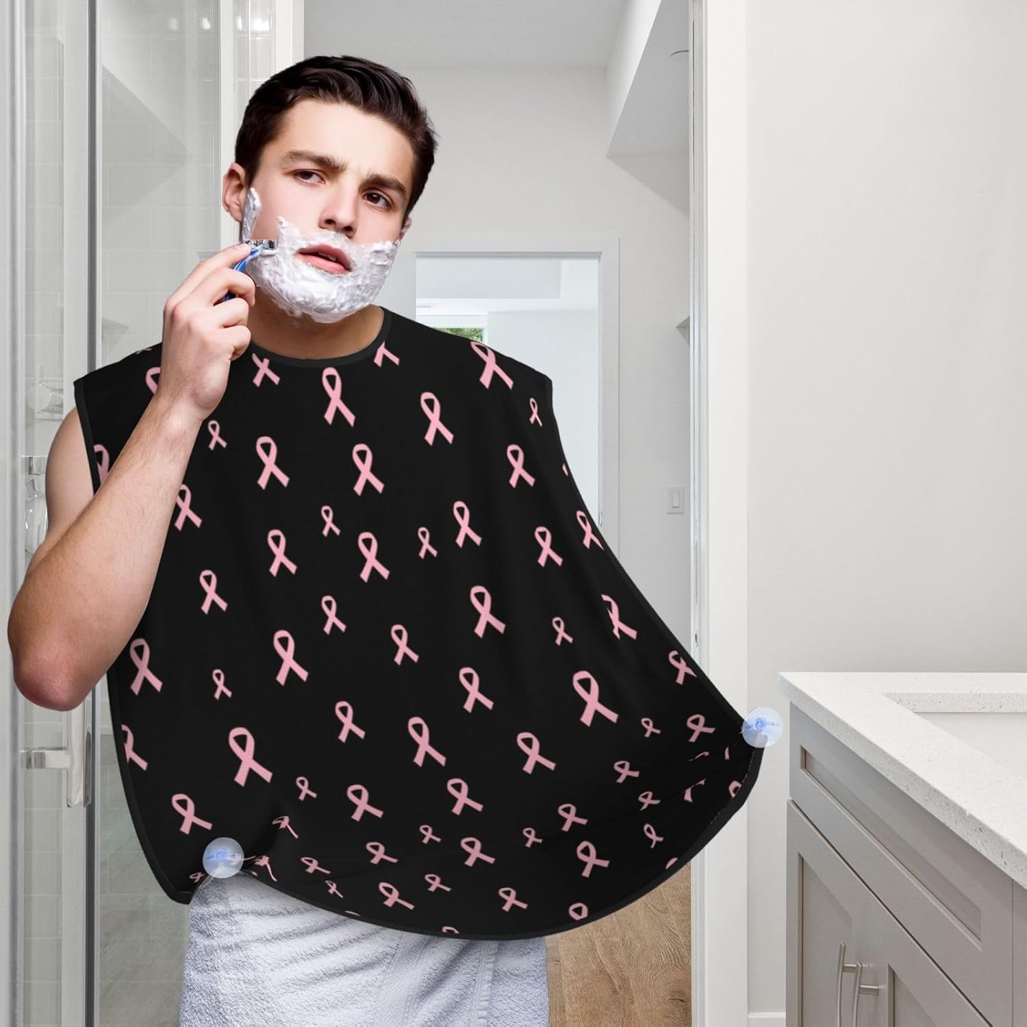 Non-Stick Beard Bib for Shaving, Breast Cancer Ribbon Black Shave Bib, Waterproof Hair Catcher with Suction Cups, Grooming Apron Men Husband