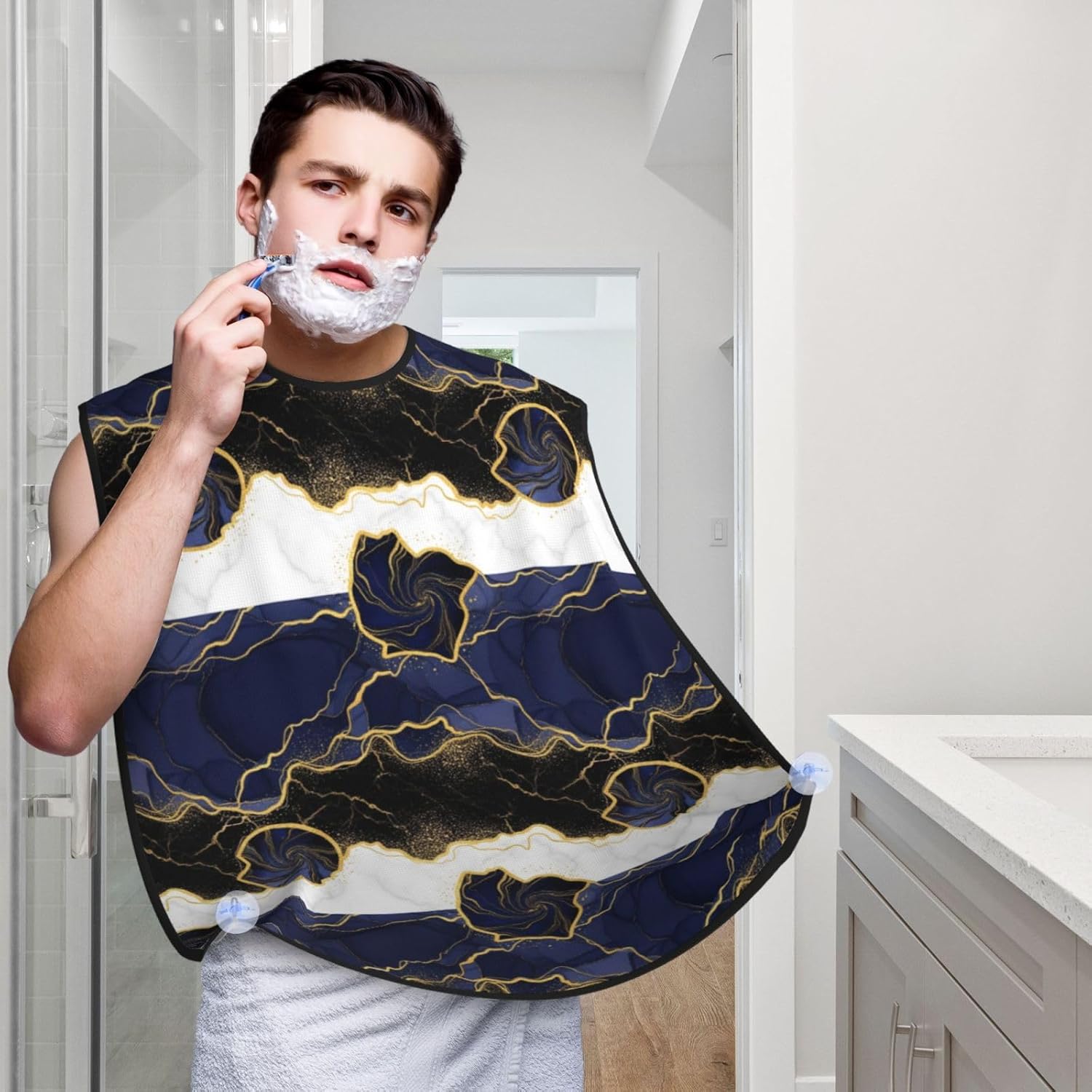 Beard Hair Catcher Bib, Waterproof Non-Stick Grooming Apron for Shaving Trimming, Perfect for Men Dad, Navy Blue Golden Marble Shave Bib