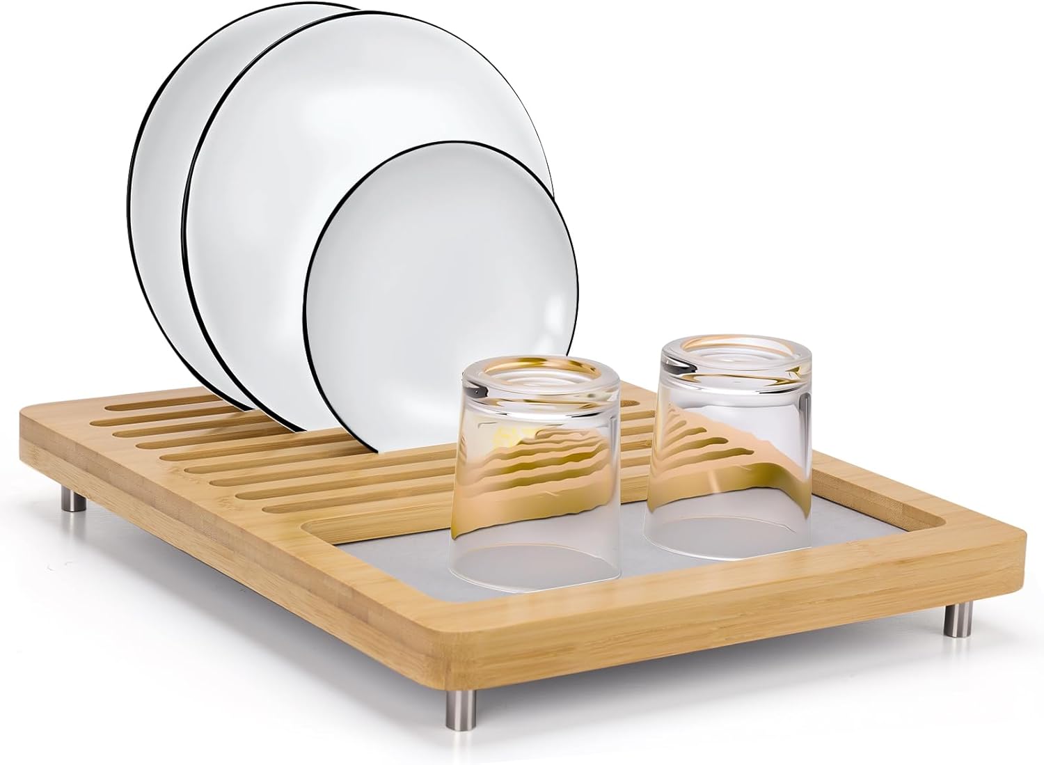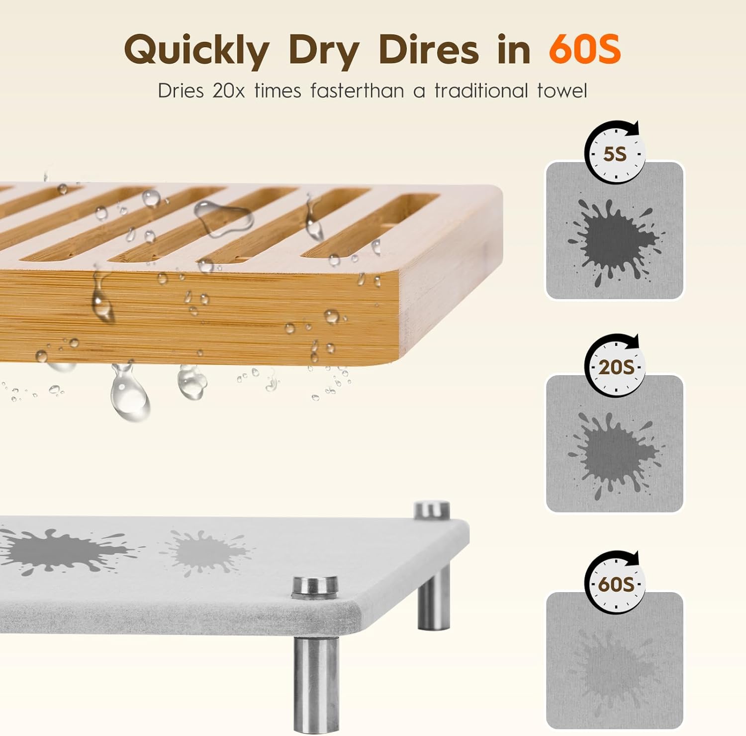 - 1.【Fast Absorption, Premium Materials】: This bamboo dish drying rack combines high-quality bamboo with natural diatomite stone, ensuring rapid water absorption. Measuring 15.5” (L) x 12” (W) x 0.9” (H), the drying stone for kitchen counter effectively soaks up excess dampness, keeping your dishes dry and preventing water stains, ensuring a clean and fresh kitchen