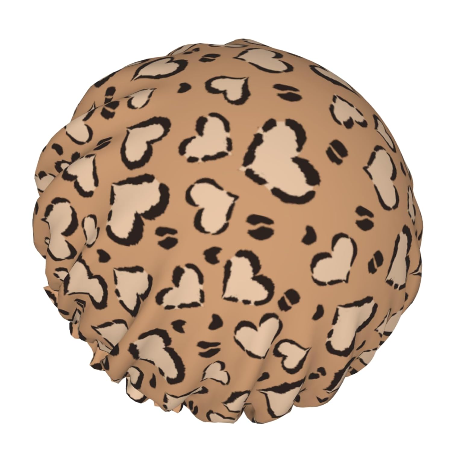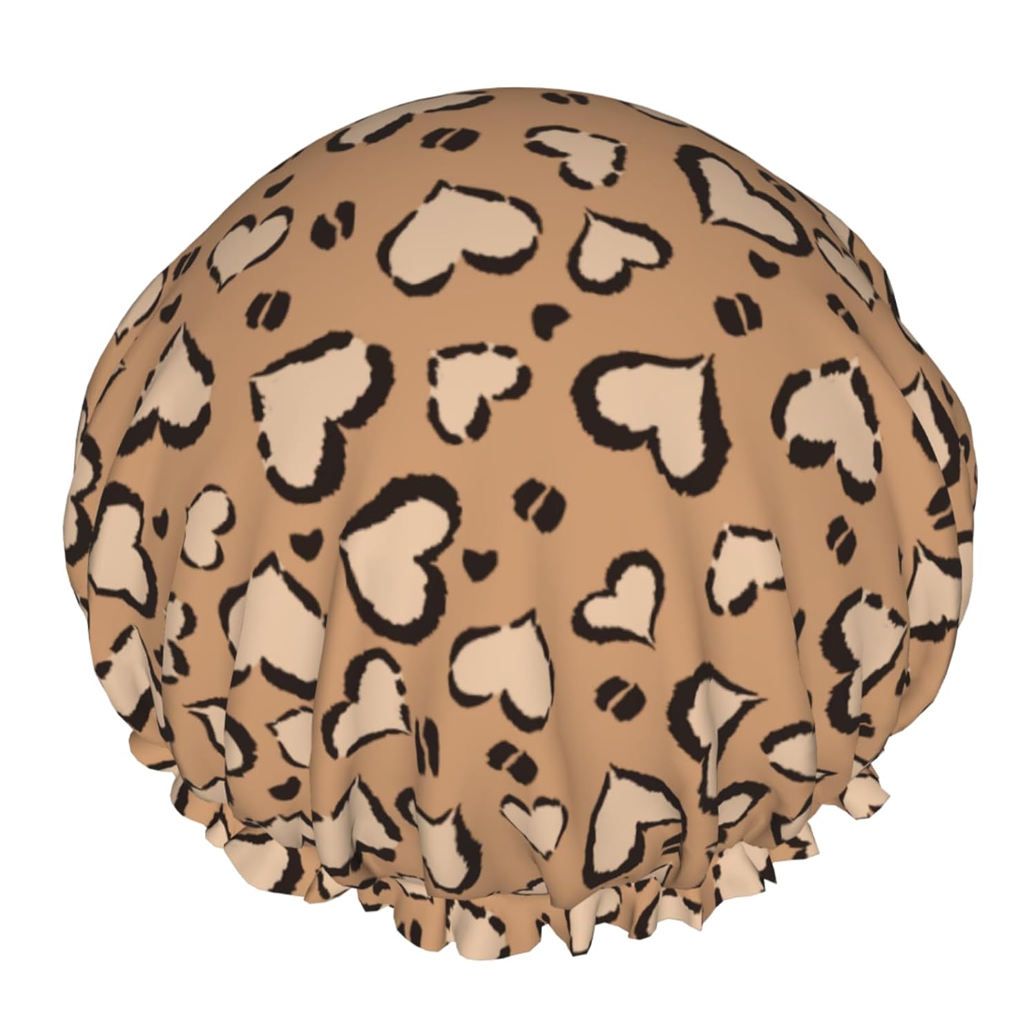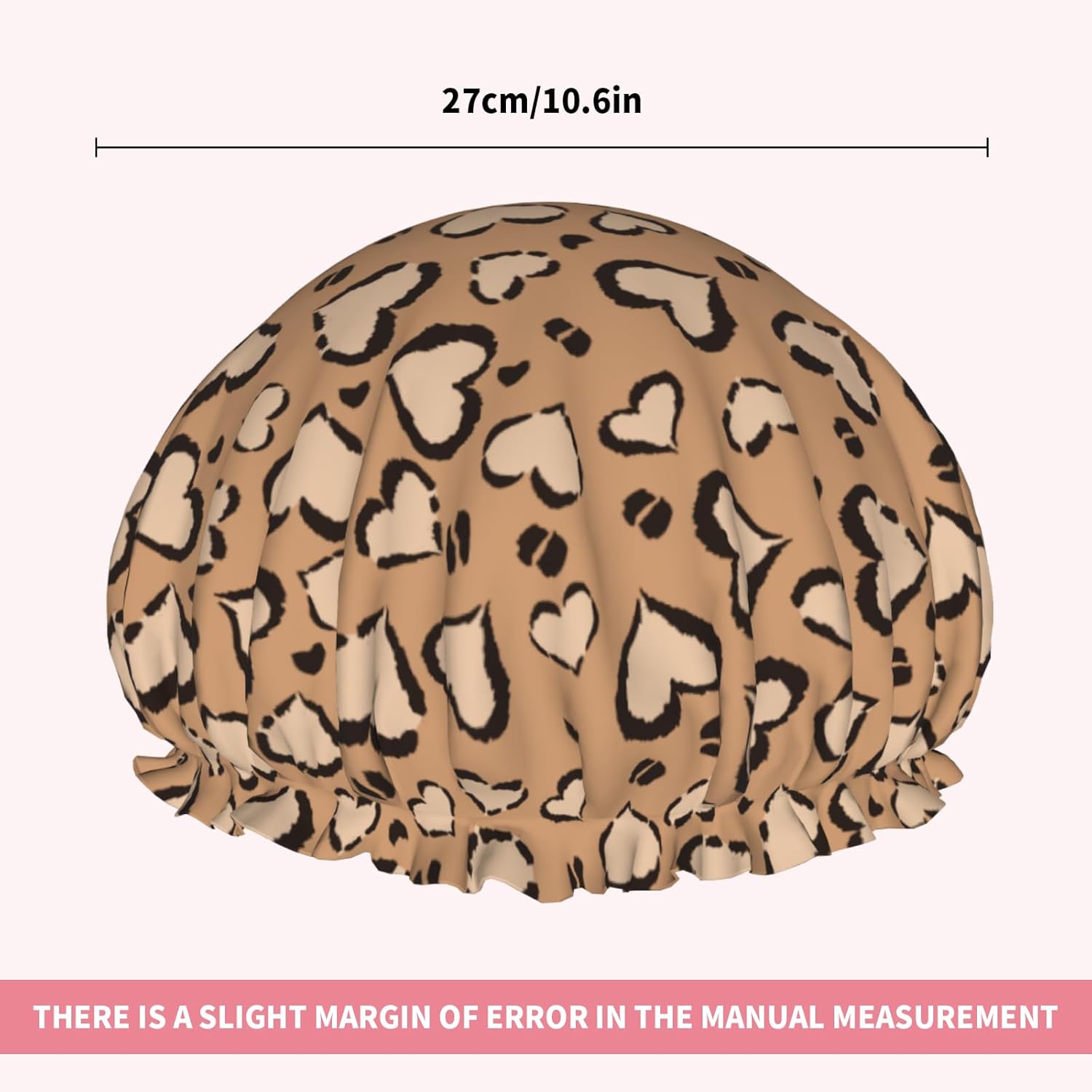 Leopard Print Shower Caps Brown Heart Dual-Layer Waterproof Bath Hat Reusable Hair Caps Elastic Hair Hat for Shower Cooking Clean Makeup Travel