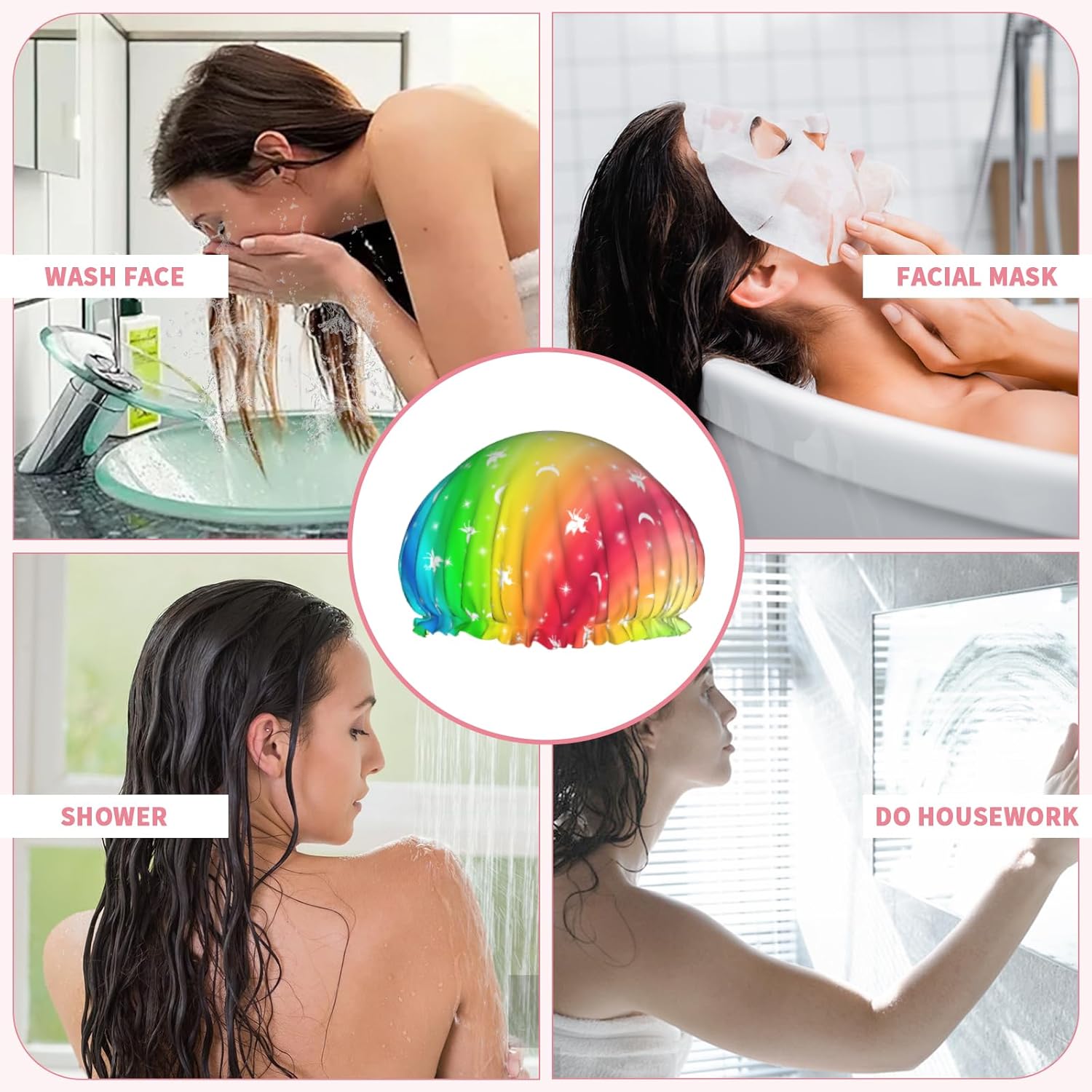 - Versatile Application: Our reusable rainbow shower caps can be used for showering, cooking, household cleaning, and spa sessions, keeping your hair dry and protecting it from dust and cooking fumes. This rainbow bath hair hat also fit for makeup, face washing, and applying facial mask, due to it suitable for all hair types-long, curly, voluminous or short, adding more convenience and beauty to your daily life.