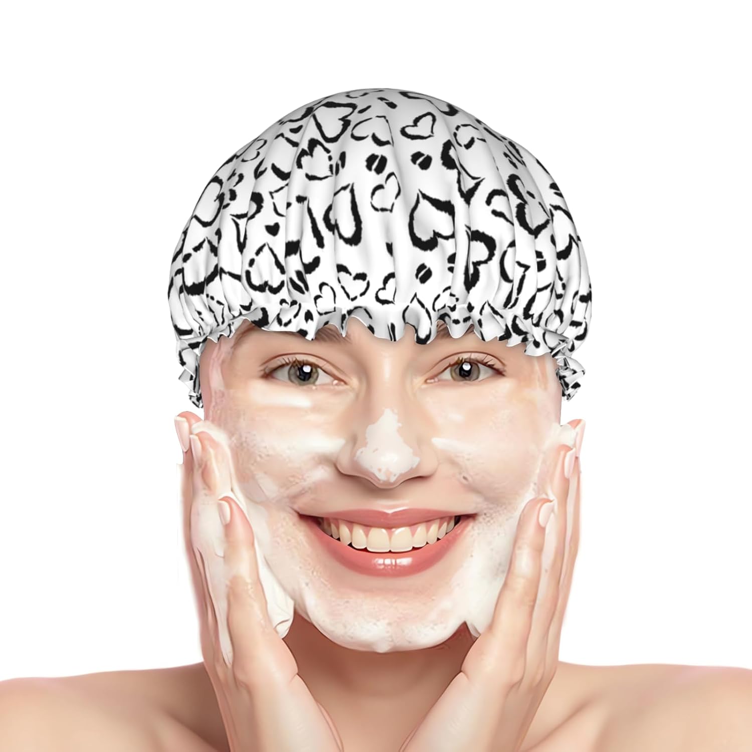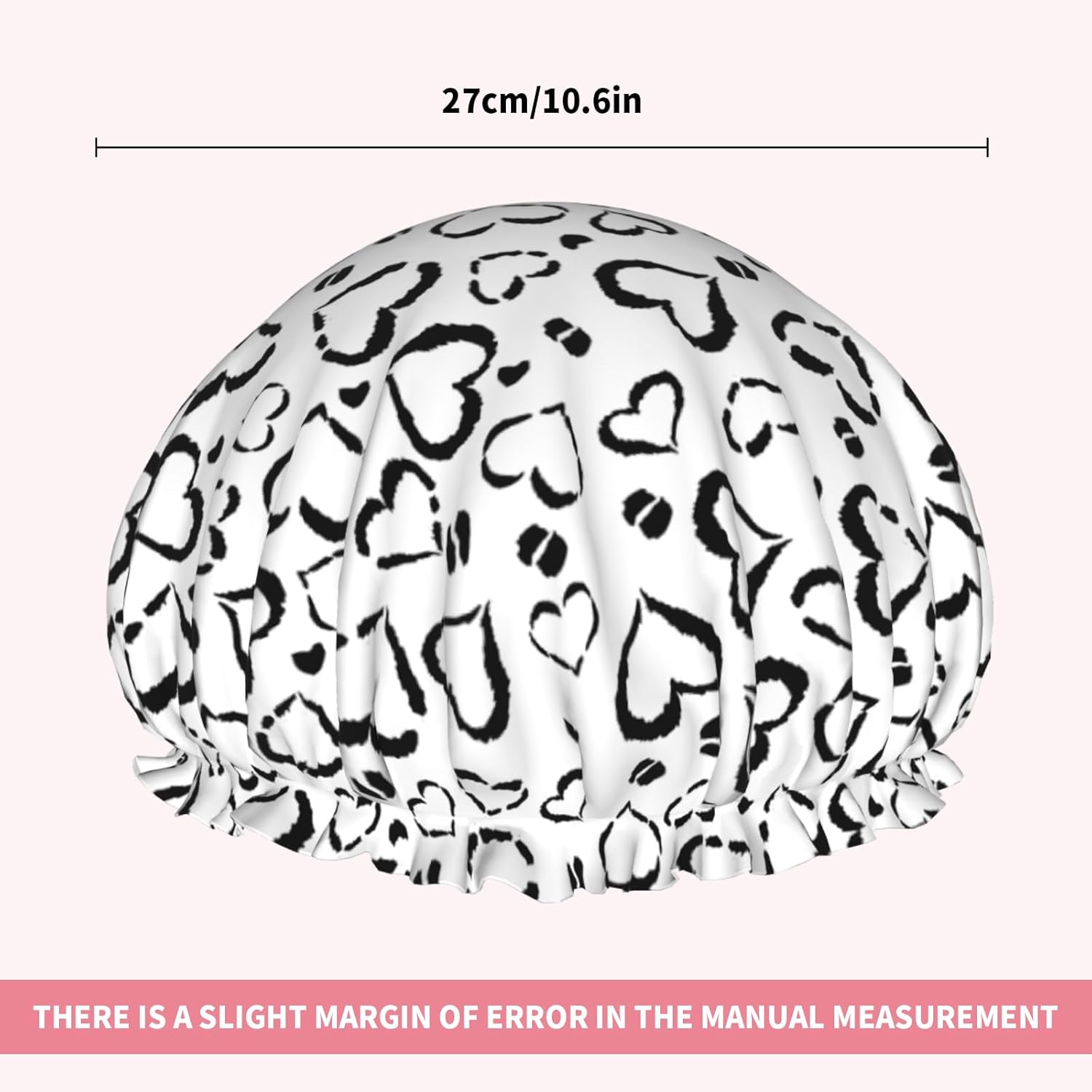 Black Heart Leopard Print Shower Caps Dual-Layer Waterproof Bath Hat Black White Hair Caps Elastic Reusable Hair Hat for Shower Cooking Clean Makeup Travel