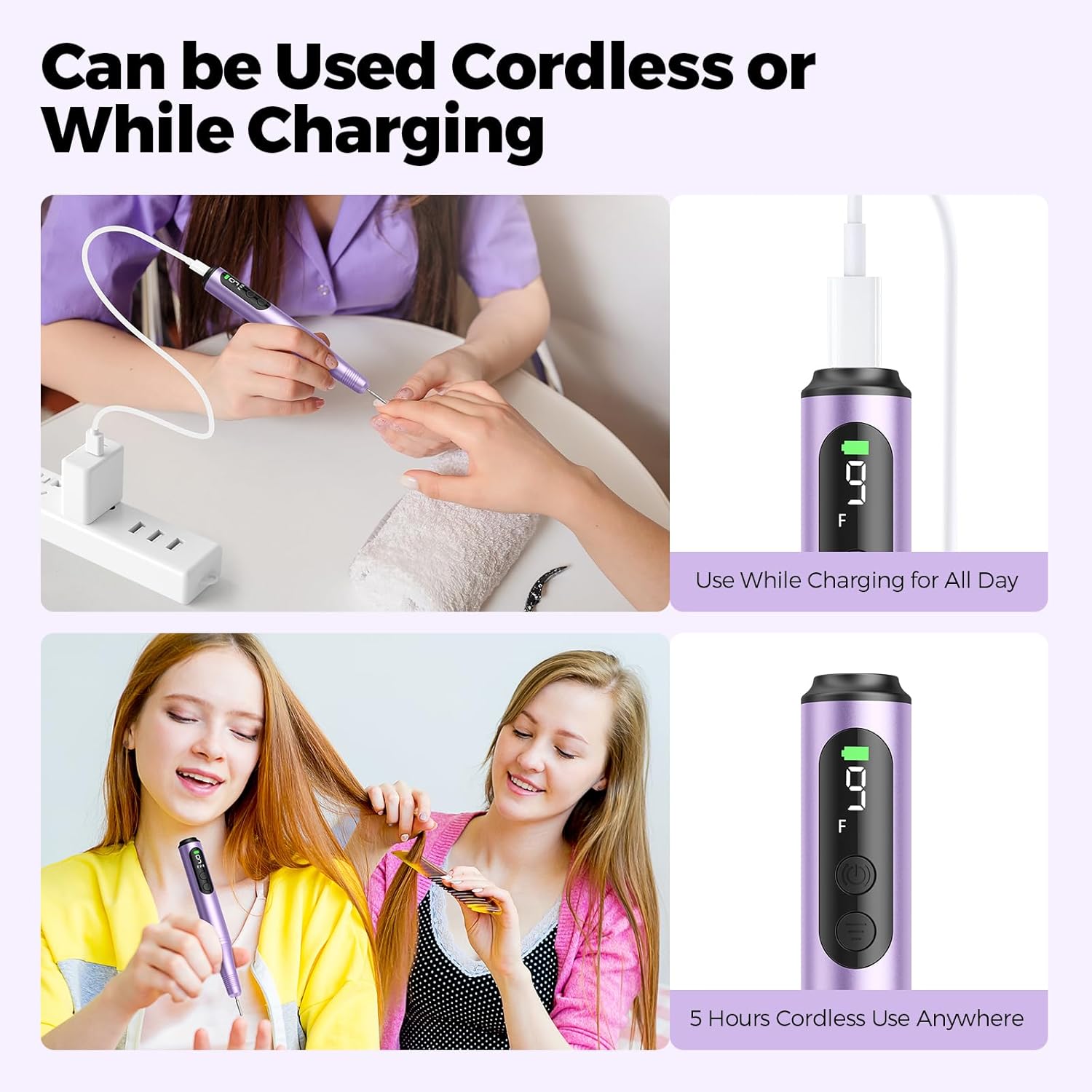 Cordless Electric Nail Drill File Kit Professional Portable Electric Nail File Set Machine for Acrylic Gel Nails,Toenail Hand Feet Care,9 Speed with LED Display Ideal Gift for Men and Women-Purple