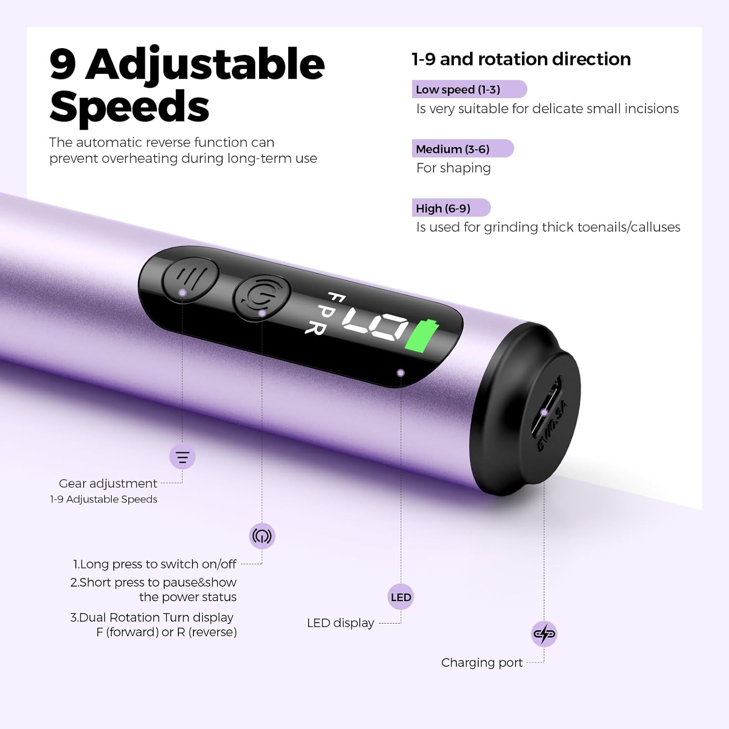 - 【Powerful Yet Quiet Motor With 9-Speed Led Display】Experience 425gf.Cm Torque Power Without The Noise!The Professional Electric Nail File Run At Just 45db(Quieter Than Rainfall) While Max Speed To Handle The Toughest Nails.The Bright Led Screen Clearly Shows Your Selected Speed (1-9) And Rotation Direction. Low Speeds (1-3) Perfect For Delicate Cuticles;Medium (3-6) For Shaping; High (6-9) For Grinding Thick Toenails/Calluses. Auto-Reverse Function Prevents Overheating During Extended Use
