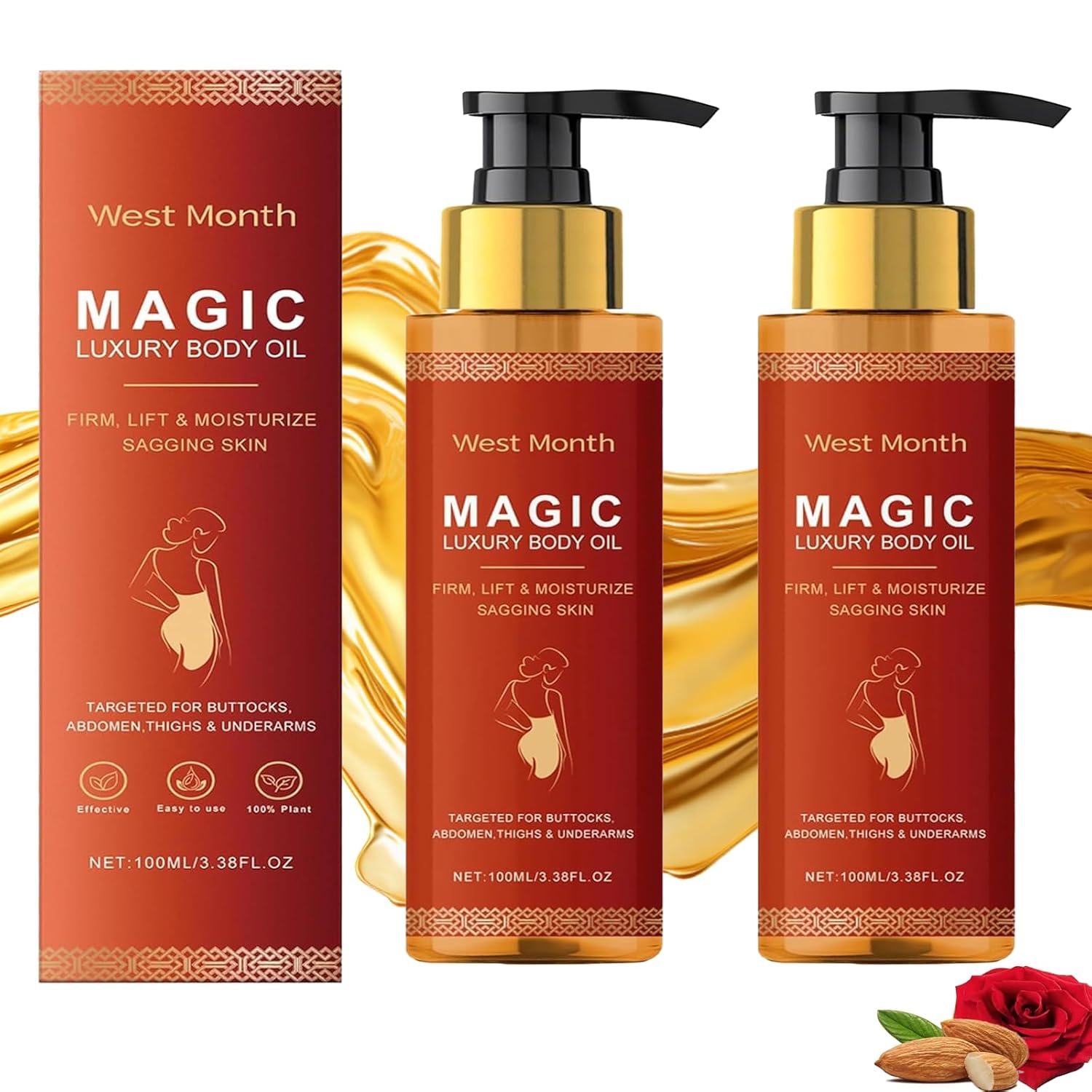 - Nourishing Skin Care: This magic body firming oil is made from a blend of natural ingredients such as sweet almond oil, vitamin E, and rosehip, which deeply moisturize the skin, leaving it soft, smooth, plump, and radiant.