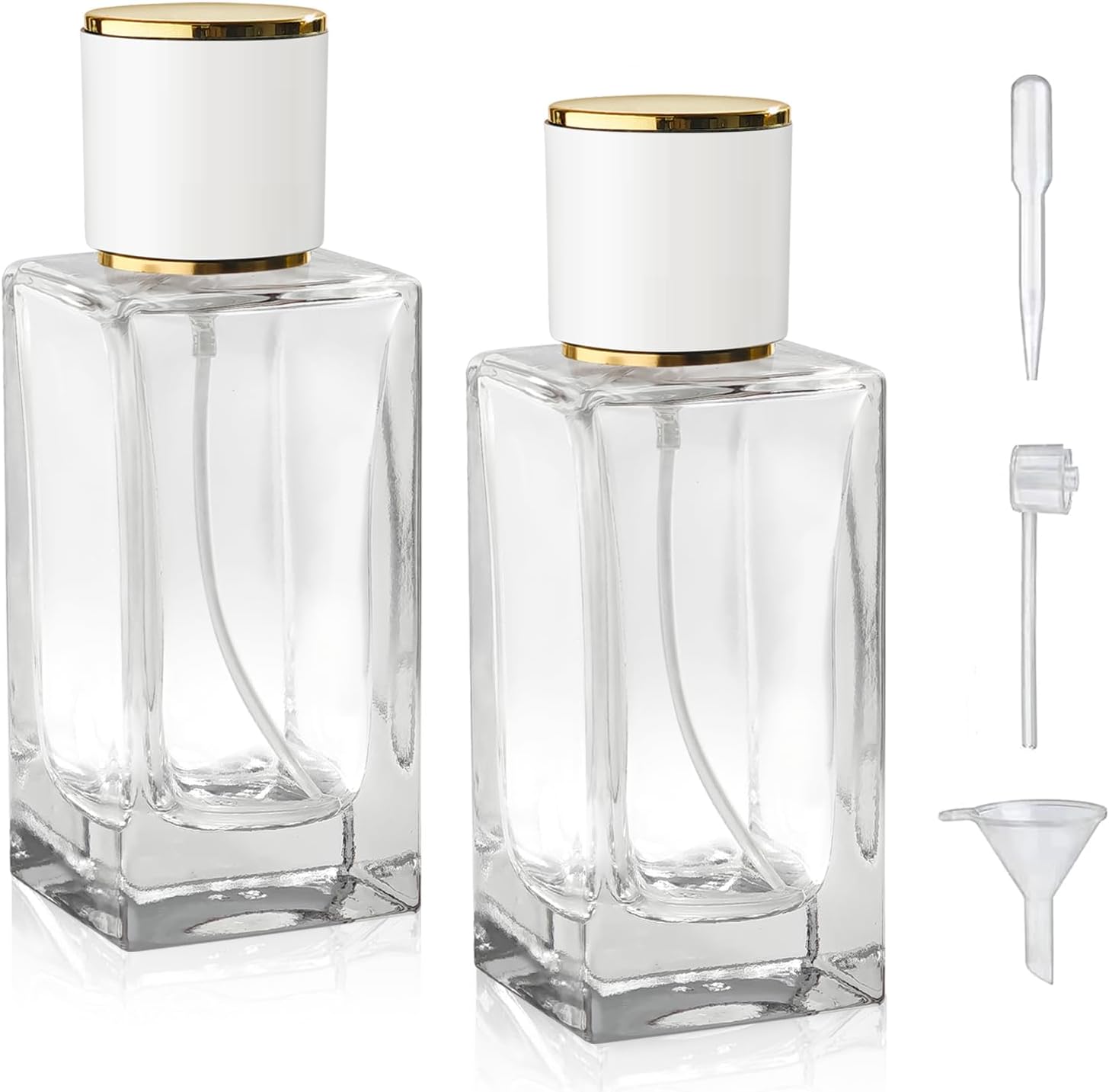 2 Pack 50ml/1.7 Oz Glass Spray Bottle Perfume Atomizer,Empty Travel Refillable Perfume Spray Bottle with 3 Kinds of Dispenser (White Cap, 50ml)