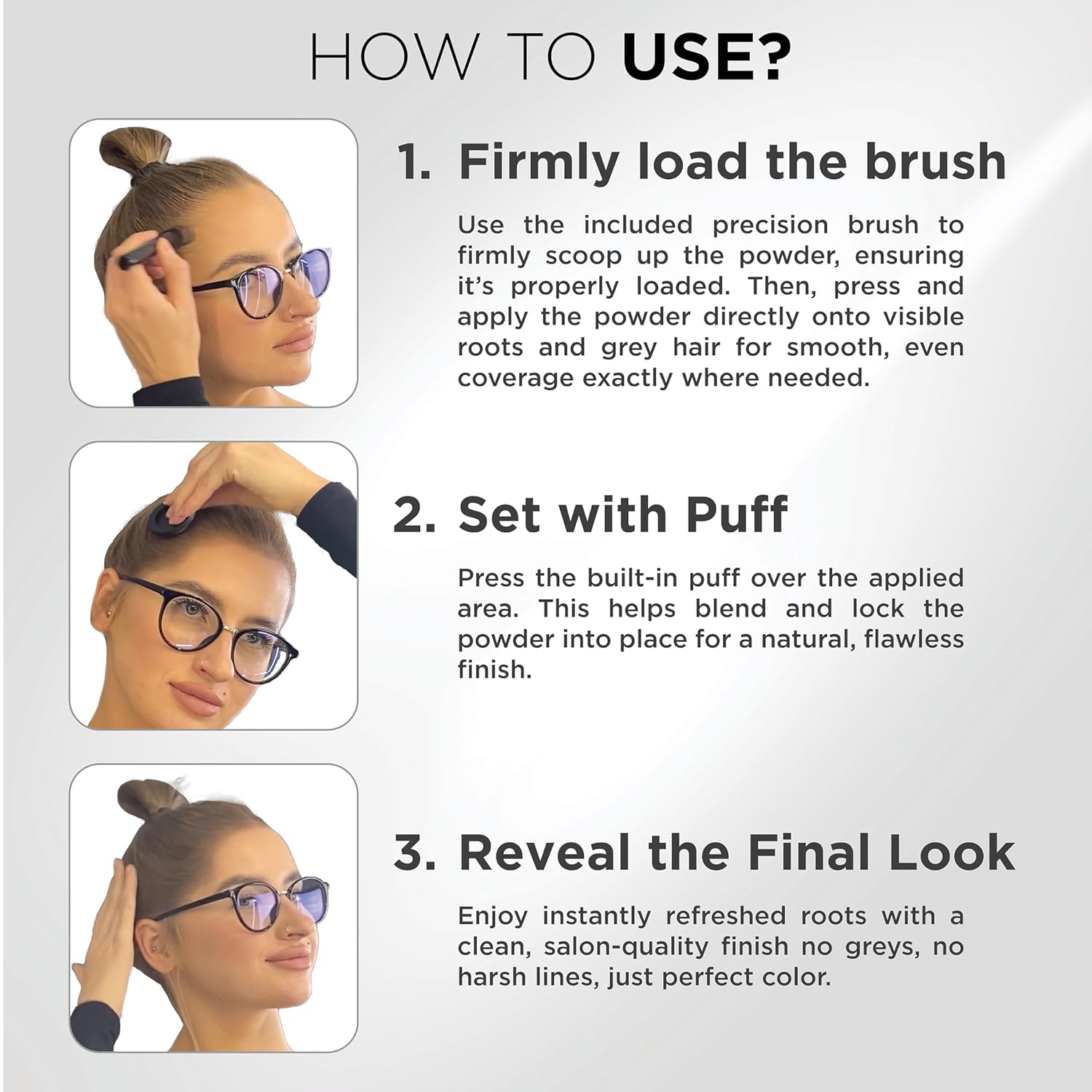 - COMPLETE SET FOR EASY APPLICATION: Unlike other thinning hair products, we've made achieving perfect hair a breeze with our comprehensive Root Touch Up Powder set. Included in the root touch up powder to cover grey hair package are a handy puff, a convenient mirror, and a precision brush. These hair loss powder tools ensure that you can effortlessly apply the root cover up powder, making touch-ups a breeze.