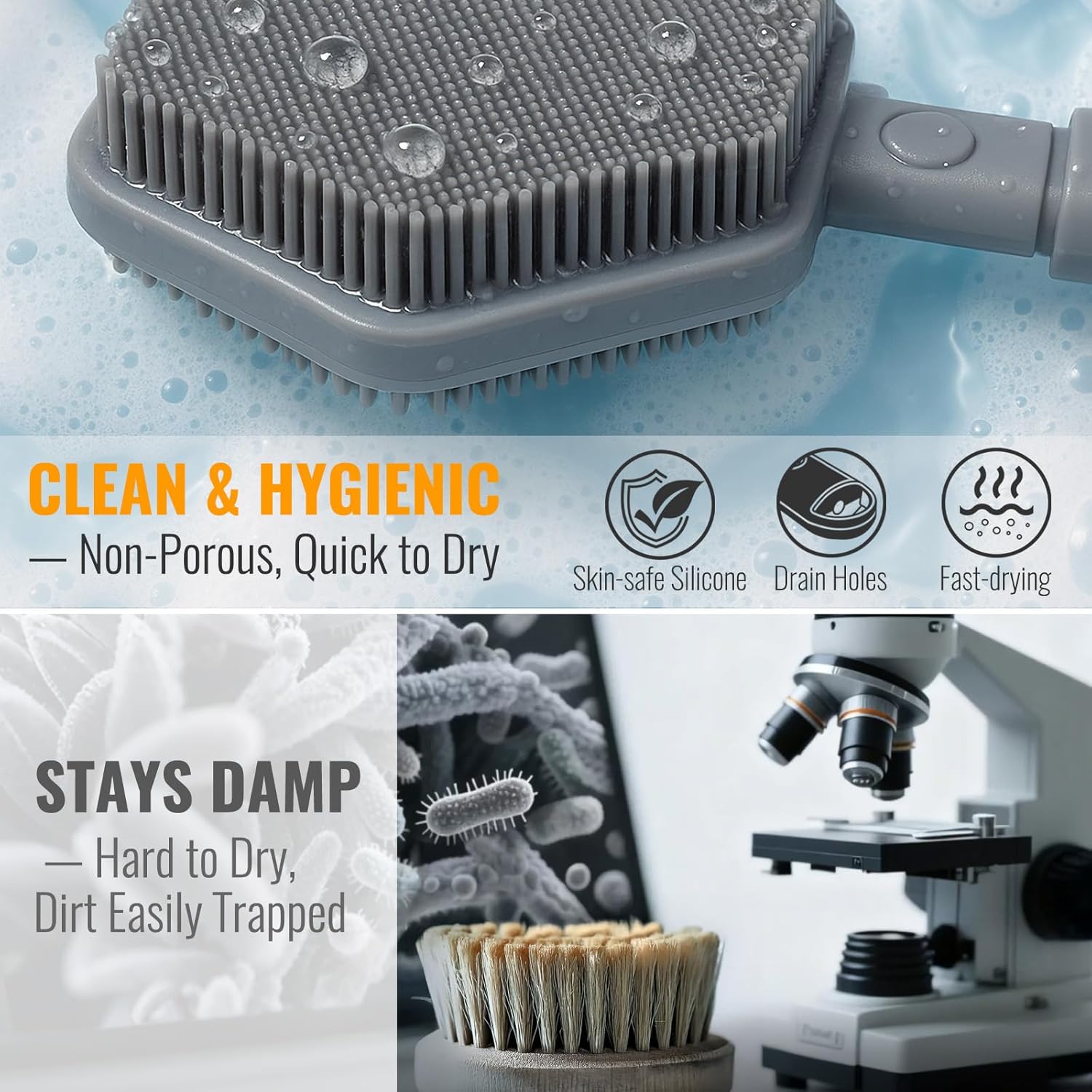 - Safe, Hygienic, and Easy to Clean: Made from premium skin-safe silicone, This silicone back scrubber for shower dries quickly and keeps fresh, ensuring a hygienic, worry-free shower every time. Soft yet durable bristles ensure safe, comfortable care for every family member.