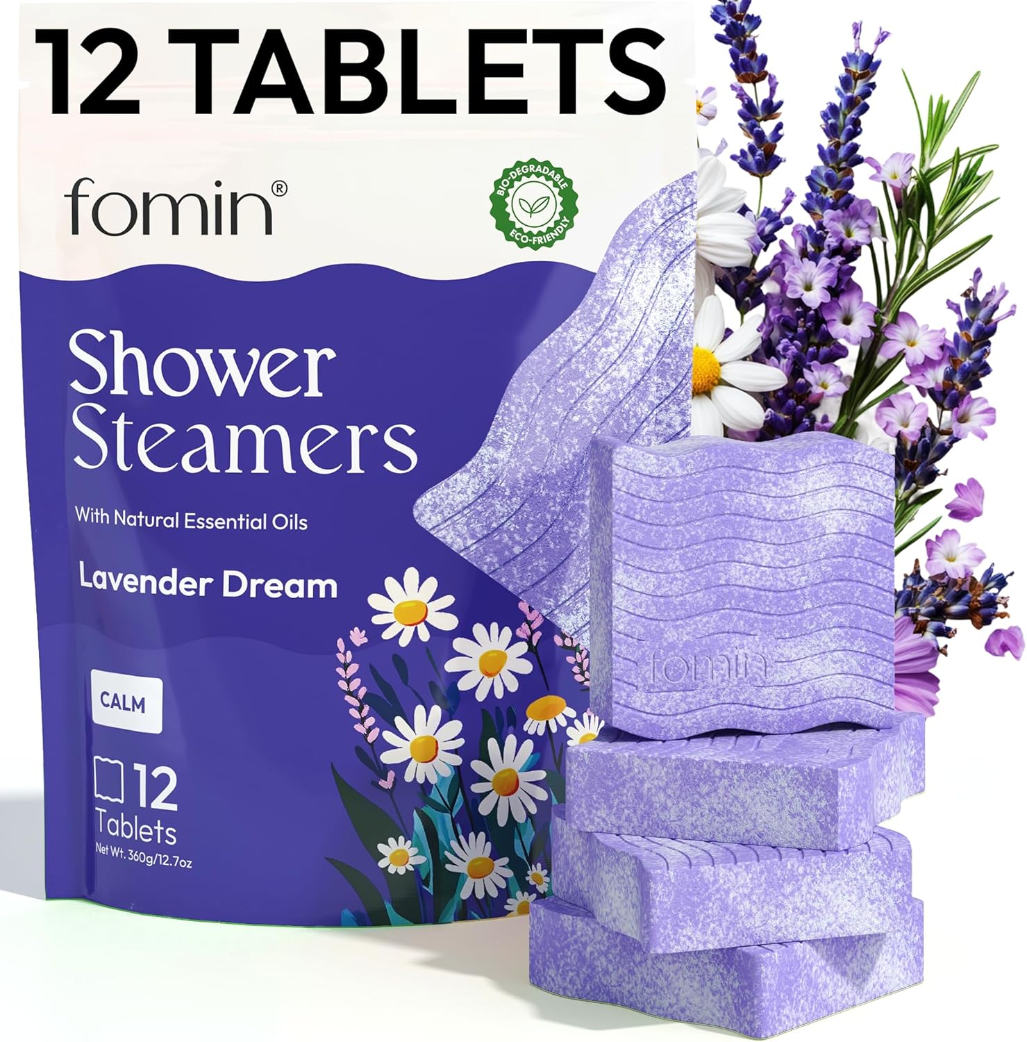 FOMIN Aromatherapy Shower Steamers - 12 Count - Lavender Dream Bath Bombs with Essential Oils for Stress Relief & Relaxation - Self Care, Spa Gifts for Women and Men - Shower Aroma for Body Wellness