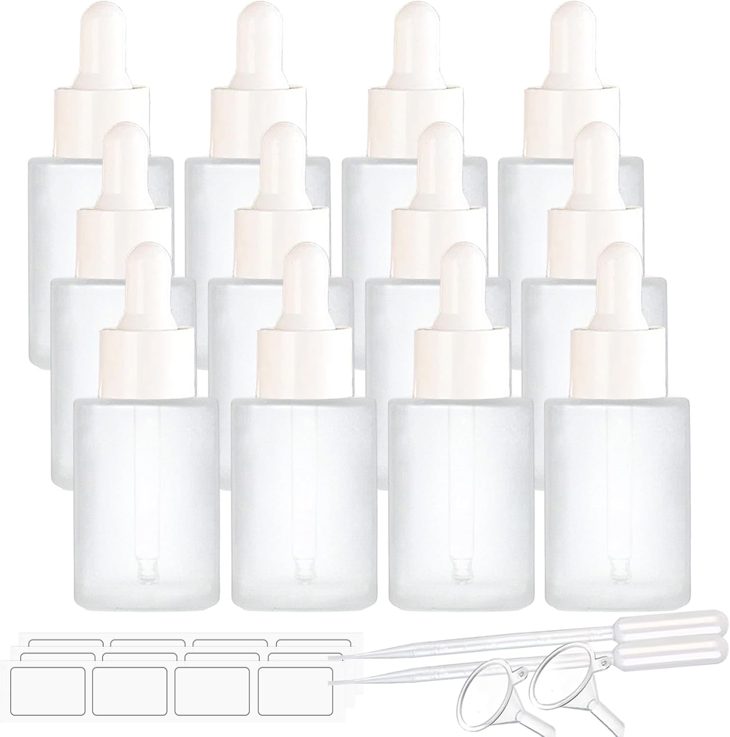 - Package includes: 12 pcs 30ml frosted glass bottles with glass eye droppers, 2 funnel for easy filling, 2 dropper,12 labels