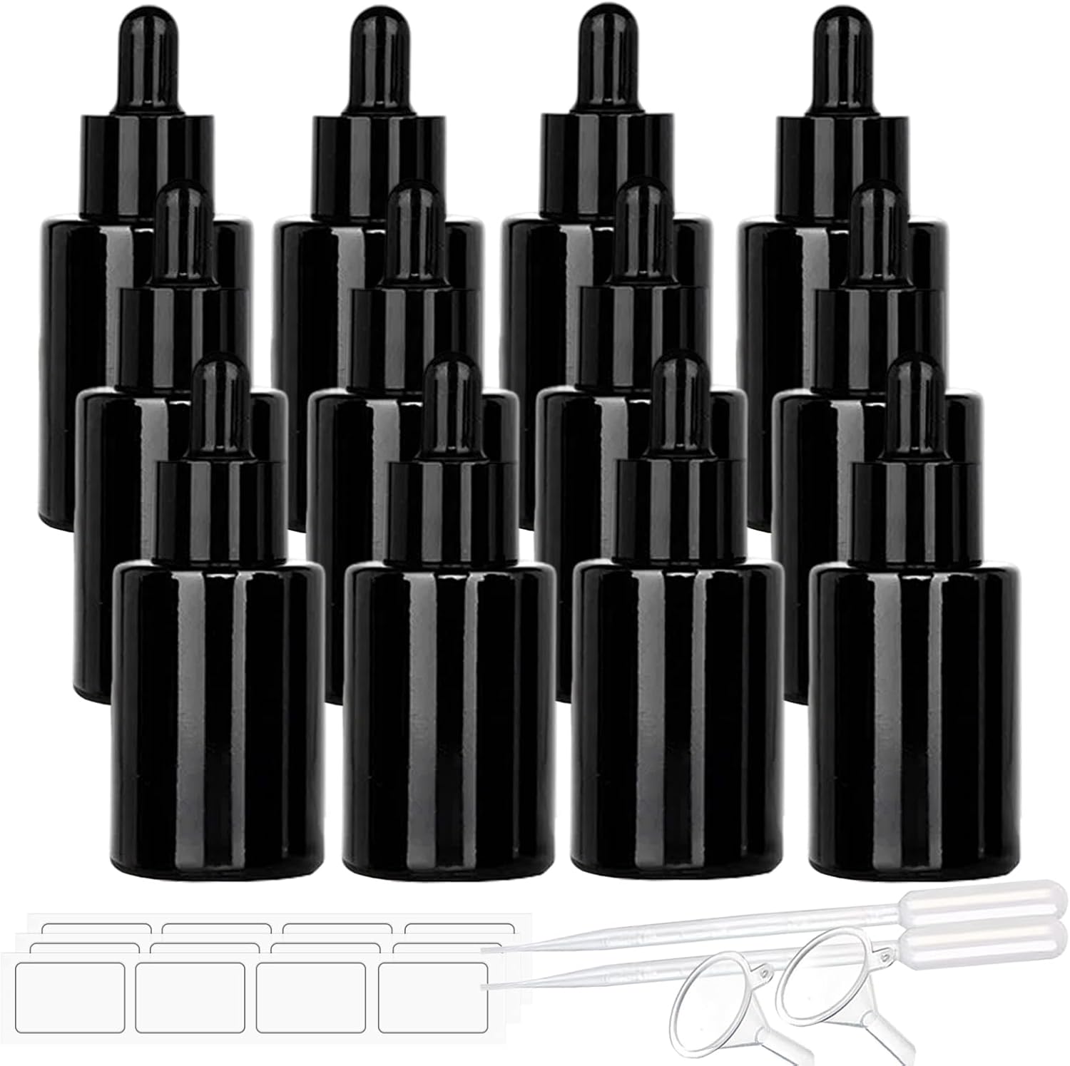 - Package includes: 12 pcs 30ml black glass bottles with glass eye droppers, 2 funnel for easy filling, 2 dropper,12 labels