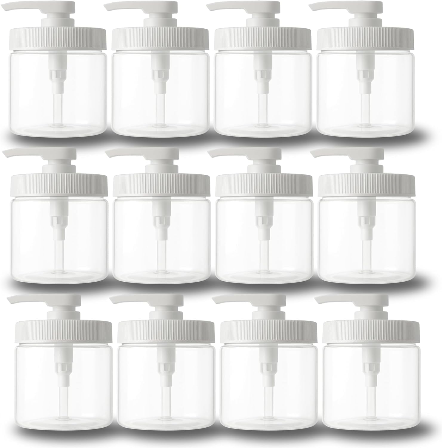 Royal Massage 16oz Refillable Pump Jar with Locking Dip Tube Dispenser – BPA-Free Plastic Container for Massage Oils, Lotions, Creams – Ribbed Lid Wide-Mouth Jar – Durable & Reusable (Clear/White, 12)