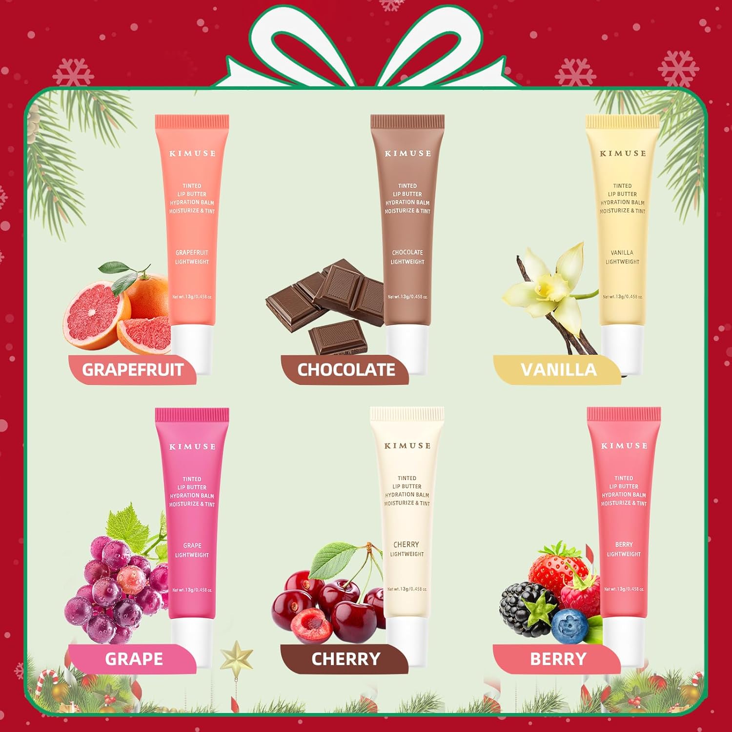 KIMUSE 6 Pcs Tinted Lip Butter Hydration Balm Set, 6 Flavored Shades Hydrating Plumping Gloss with Hyaluronic Acid & Vitamin E, Sheer Tint, Non-Sticky | Vegan Lip Care Makeup for Dry Lips & Daily