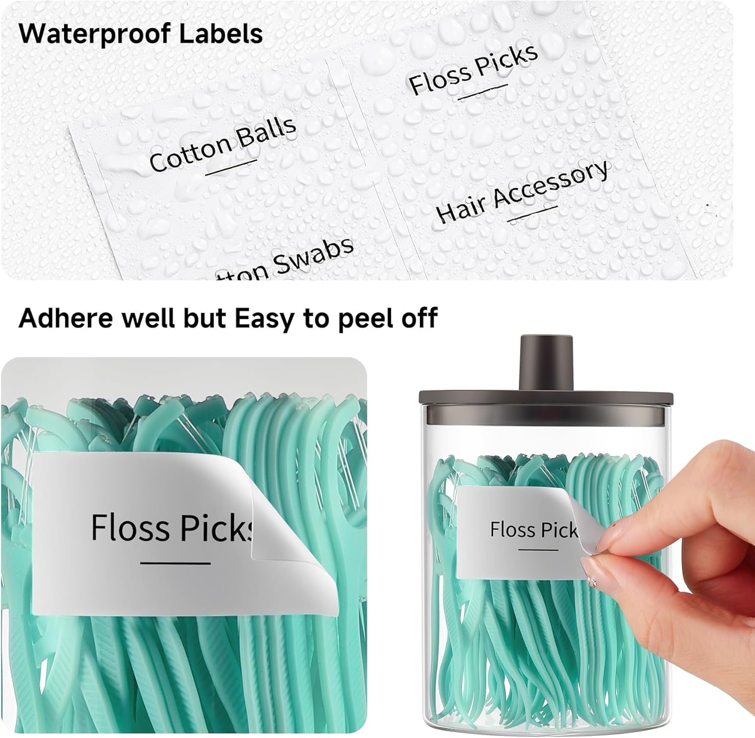 - What’s Included: 2 Glass q tip holder dispensers with lids + 8 transparent labels +8 White Labels