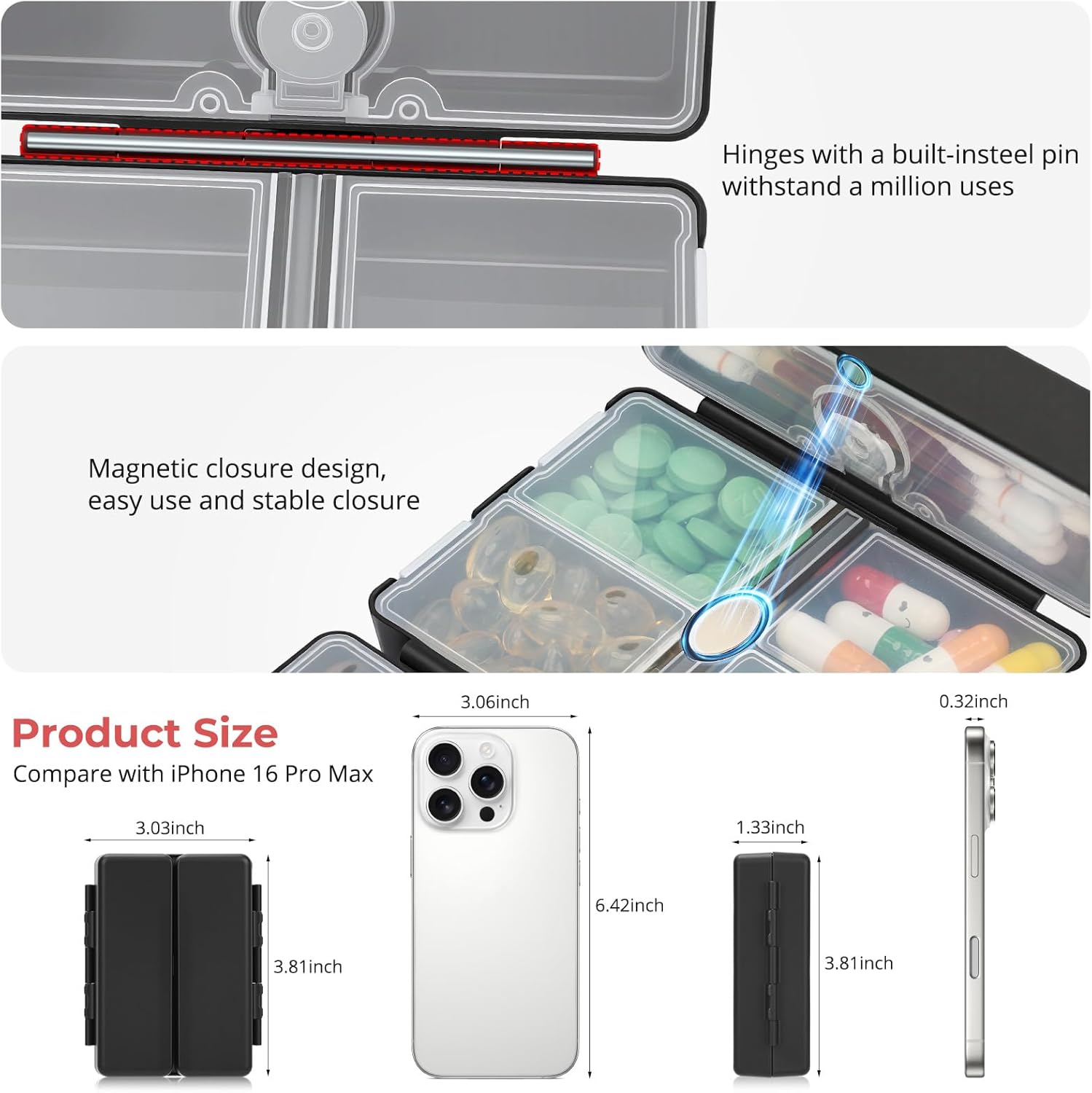 - Compact & Portable: With its slim fodable size: 3.81(L) x 3.03(W) x 1.33(H) inch, this pill organizer easily fits into pockets, purses, or backpacks, making it ideal for travel and daily use.The lids of the 4 middle compartments of this pill box are detachable, making it easy to fill pills.