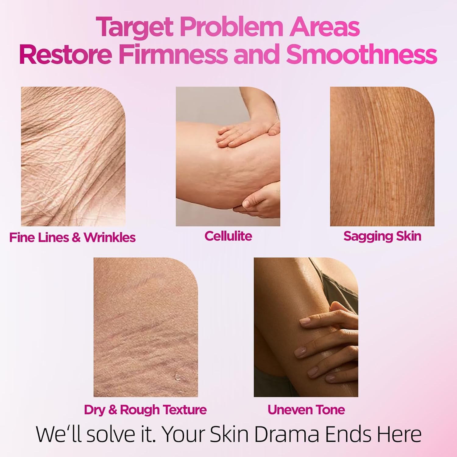 - Reduce Stubborn Cellulite & Crepey Texture: Targets the appearance of loose, uneven, or crepey skin on common concern areas such as the belly, thighs, and buttocks. With consistent use, it supports a more toned, sculpted, and refined look.