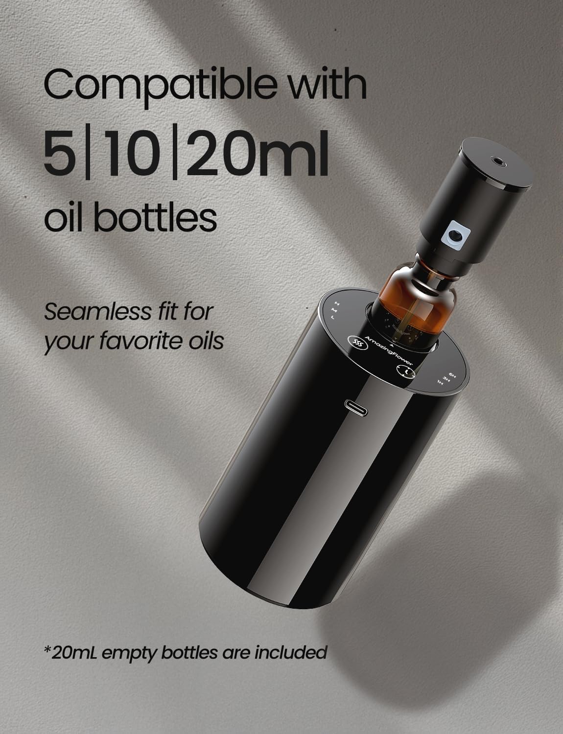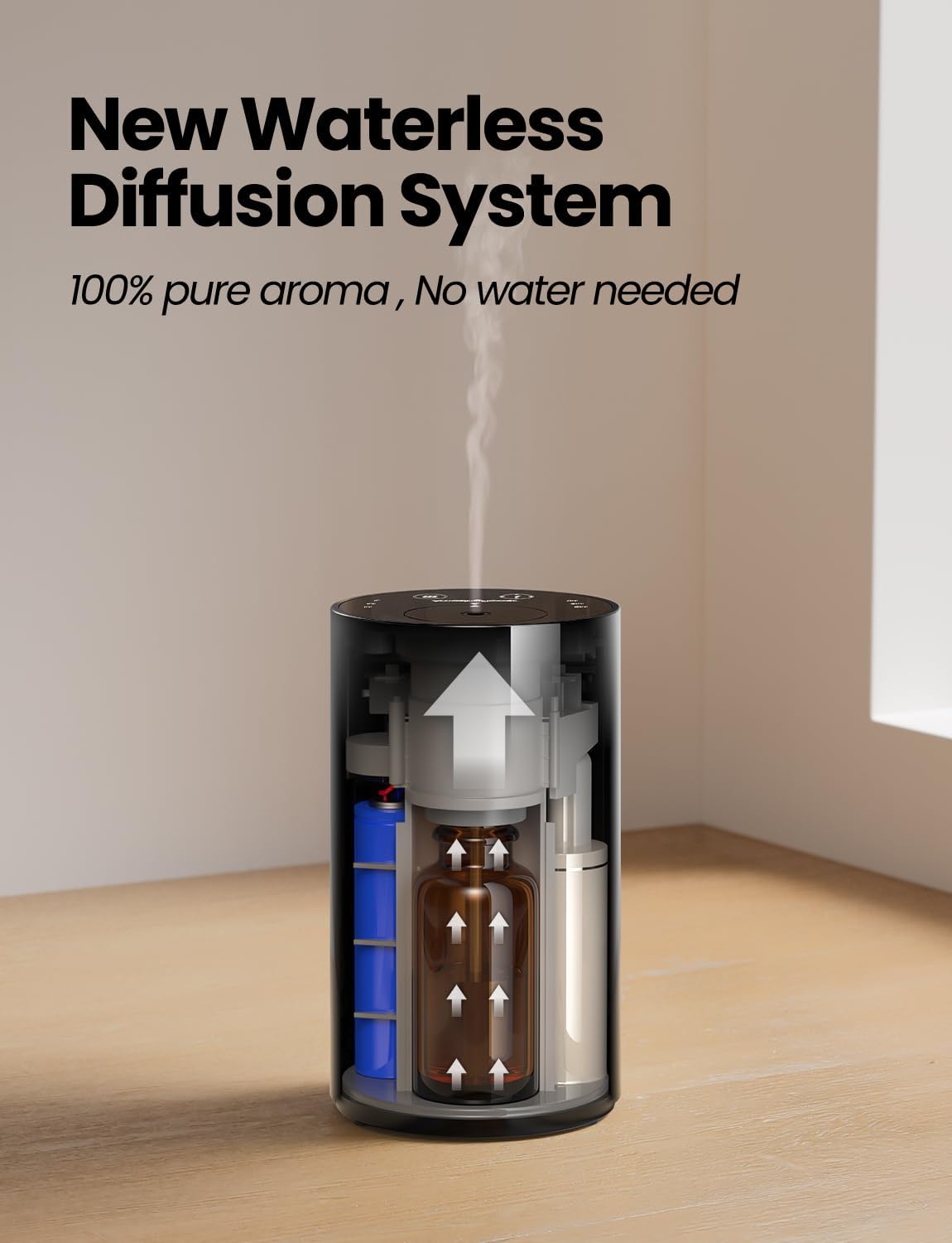- ăWaterless Essential Oil Diffuser for Pure AromaăOur advanced waterless diffuser technology transforms your favorite essential oils into a pure nano-mist without heat or water. Unlike traditional ultrasonic diffusers, it maintains the full strength and purity of each drop, offering a natural and convenient aroma experience. Perfect for those who want a scent diffuser that preserves essential oil integrity.