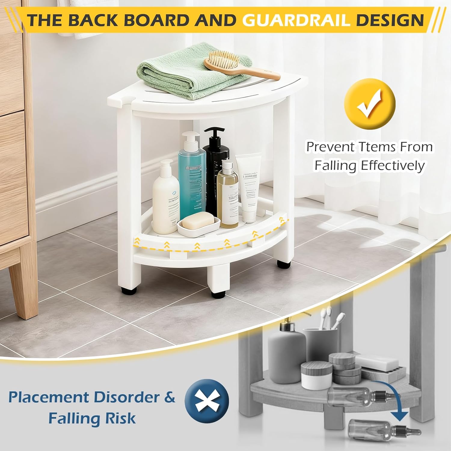 - 【2-tier storage shelf】A 2-tier storage shelf provides convenient storage for all shower essentials like your shampoo and body wash, shaving stuff,etc. The back board of the durable corner shower stool can effectively prevent items from falling and protect products.