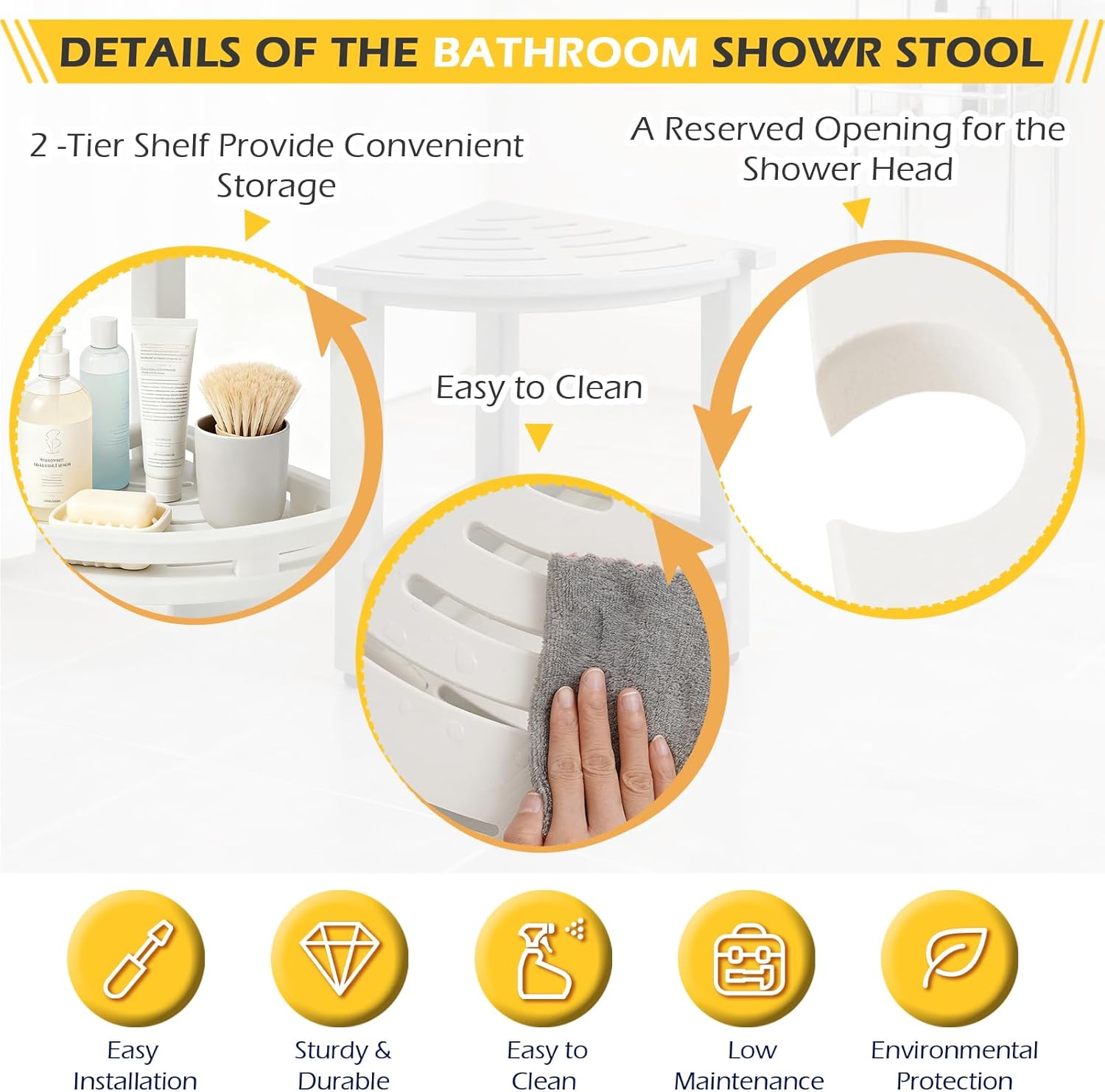 HDPE Corner Shower Stool for Shaving Legs, Waterproof Shower Stool with Storage Shelf for Bathroom,White