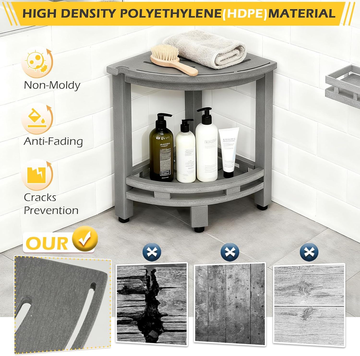 - 【Durable Premium Material】This corner shower stool is made of HDPE material, environmentally friendly, 100% waterproof. It won't mold, crack or fade, can be safely washed with water. All connecting fasteners are made of 304 stainless steel screws.