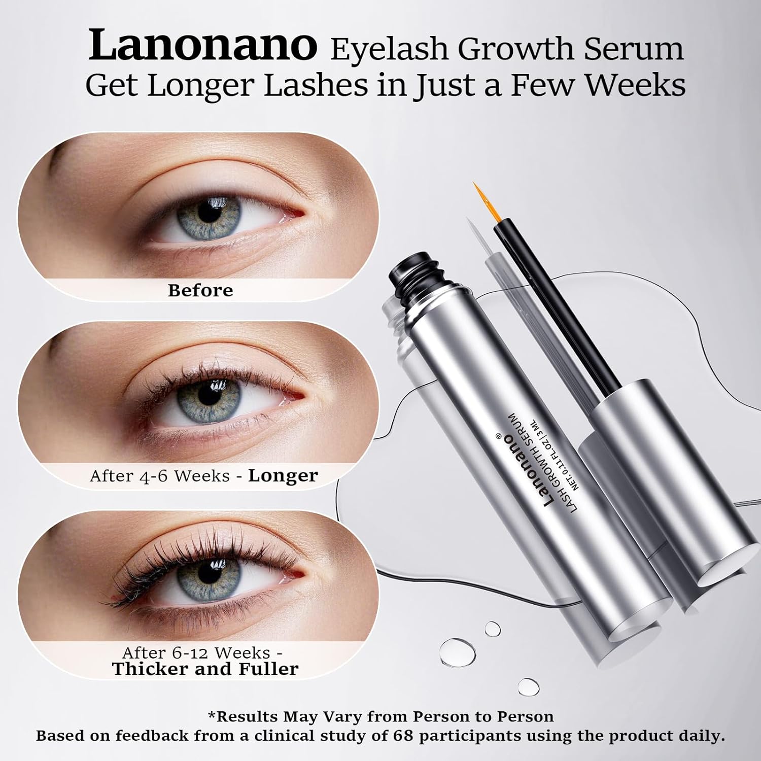 - Safe & mild for all skin types: Formulated with a harmonious blend of science and nature, Lanonano's lash enhancing serum is gentle on the skin, catering to all skin types. Witness noticeable enhancements in lash volume and length in just 4-6 weeks with regular application of this eyelash growth serum, as reported by many satisfied users.