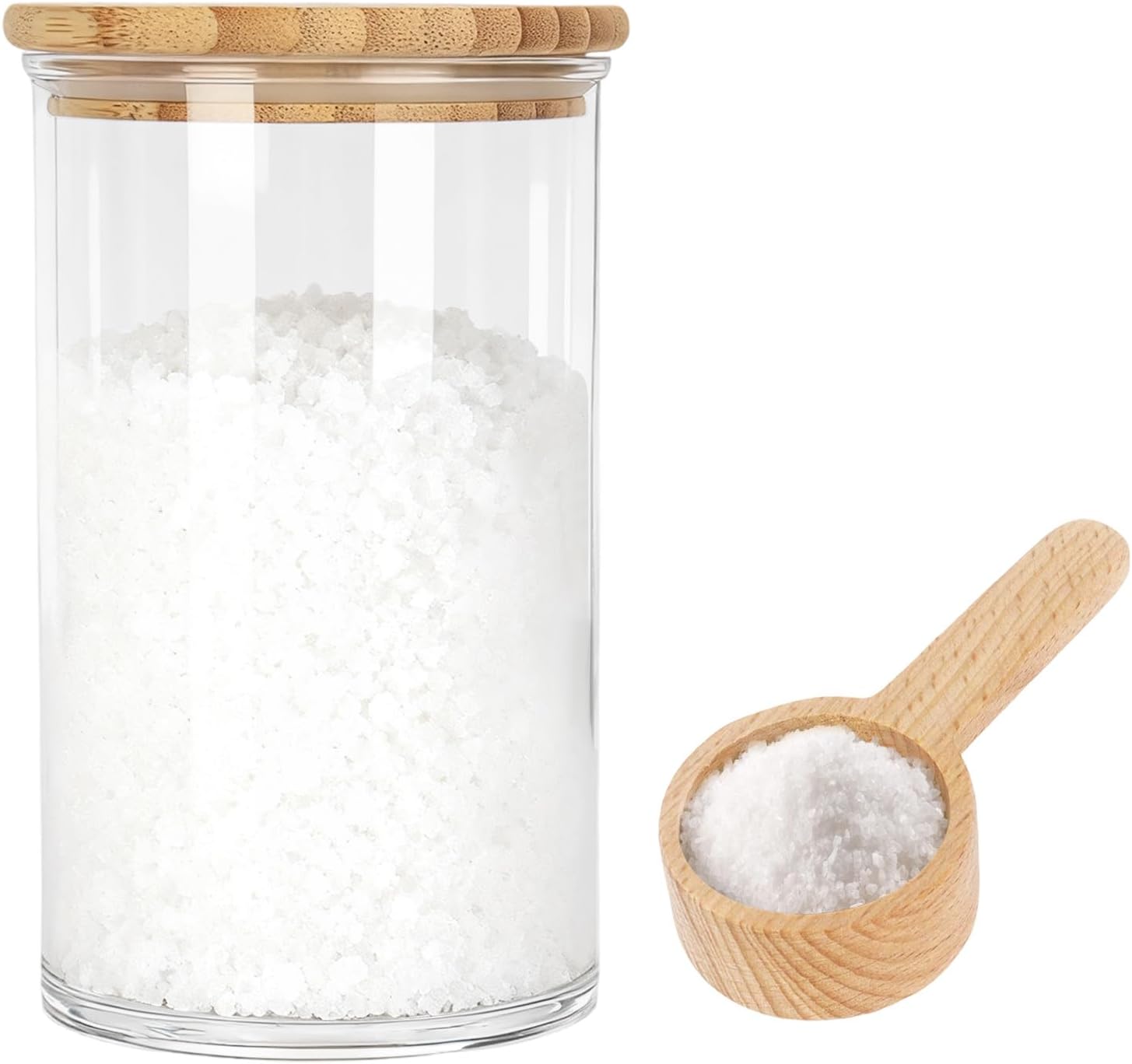 - Package Includes: The package you receive includes an bath salt jar with wooden spoon with lid. This jar is versatile enough to store cotton swabs, cotton balls, cosmetic pads